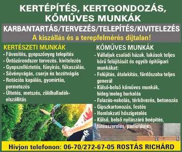 Térkövezést A-Z-ig, kisebb kőművesmunkákat, elhanyagolt terület tisztítását, veszélyes fák kivágását felelősség-vállalással, egyéb kerti munkákat vállalok. +36-20/513-1094