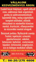 kisebb-nagyobb kőműves munkát vállalunk A-Z-ig. Tel:0630/184-0078 ácsmunkát, bádogos munkát, tetőfedést, cserepeslemezelést, beázás megszűntetést, kisebbnagyobb munkákat vállalunk. Tel:0620/403-3243