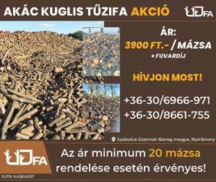 2 HIRDETÉS 2024. május 17. TŰZIFA K és F Tüzifa Bt. Nyírcsászári-Ópályi EUTR szám: AA5836125 Akác vastag guriga: 4200 /q Akác hasított: 4350 /q Akác vékony guriga: 3990 /q Akác hulladék: 3700 /q Nyár, fenyő guriga 2990 /q Akác hosszú hulladék 3400/q 42 Ft/kg 43 Ft/kg 40 Ft/kg 37 Ft/kg 30 Ft/kg 34 Ft/kg Telefonszám: 06-30/866-1054 1434909 Nyitva tartás: H- Szo.: 10 - 15 óráig V.: Zárva Tel.: 0670/529-2901