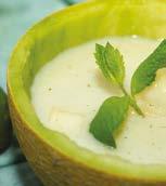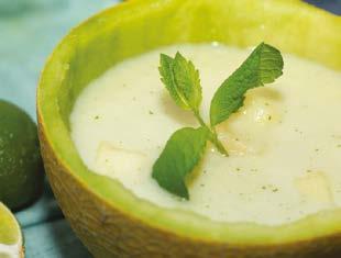 3.Az elkészült levest rögtön tálalhatjuk, de még jobb, ha pár órát hűtőben hűtjük. A dinnyehéjba rakjuk a dinnyedarabokat, erre öntjük a levest. Mentalevéllel díszíthetjük.