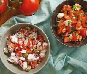3.A görög paradicsomsaláta elkészítéséhez a paradicsomot megmossuk, felaprítjuk és egy nagy tálba tesszük. Hozzáadjuk az olajbogyót, a felkockázott feta sajtot és a felaprított lila hagymát.