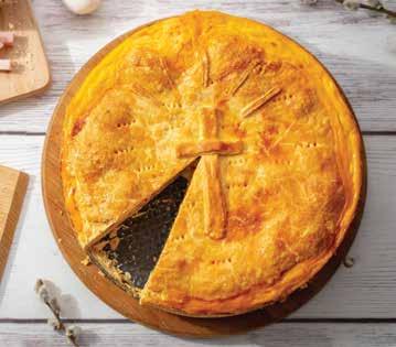6. Ráhalmozzuk a tölteléket a tésztára, a kilógó tésztaszéleket visszahajtjuk. A kisebb tésztarészt is kinyújtjuk, majd befedjük vele a pizzát. Vizes kézzel összecsipkedjük a tésztaszéleket, a maradék tésztából pedig ízlés szerint díszíthetjük a tetejét. Legvégül lekenjük az egészet a felvert tojással.