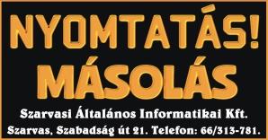 Megjelenés: hétfõi napokon 11.000 példányban Szarvas, Csabacsûd, Kondoros, Gyomaendrõd, Békésszentandrás, Kardos, Örménykút településeken. Lapzárta: Szarvason szerda 12 óra, a vidéki hirdetésfelvevõknél szerda 9 óra! Az újságban megjelent hirdetések tartalmát a szerkesztõség nem vizsgálja, értük felelõsséget nem vállal. A Kiadó az elfogadott megrendelés alapján átadott hirdetések tartalmáért, azok valódiságáért, harmadik személyeknek okozott jogsérelemért felelõsséget