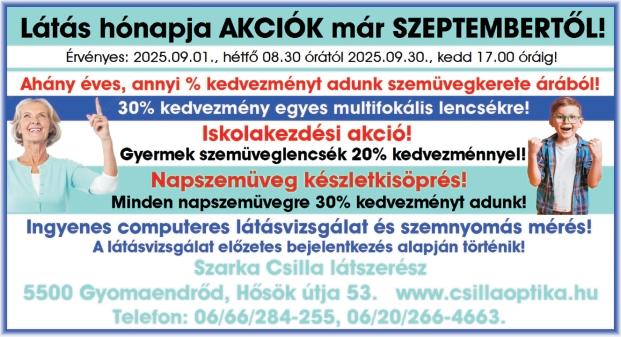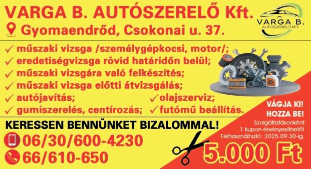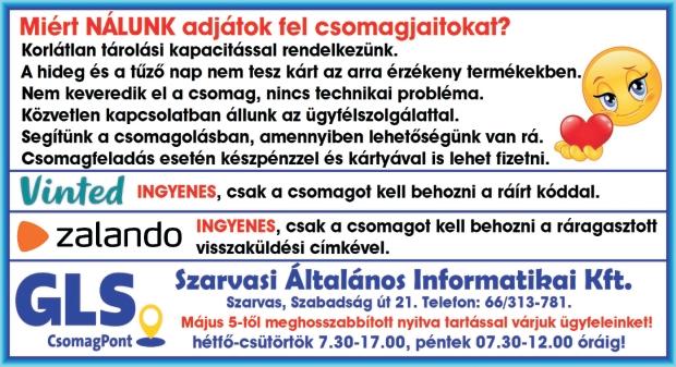 Megjelenés: hétfõi napokon 11.000 példányban Szarvas, Csabacsûd, Kondoros, Gyomaendrõd, Békésszentandrás, Kardos, Örménykút településeken. Lapzárta: Szarvason szerda 12 óra, a vidéki hirdetésfelvevõknél szerda 9 óra! Az újságban megjelent hirdetések tartalmát a szerkesztõség nem vizsgálja, értük felelõsséget nem vállal. A Kiadó az elfogadott megrendelés alapján átadott hirdetések tartalmáért, azok valódiságáért, harmadik személyeknek okozott jogsérelemért felelõsséget nem vállal, nem köteles olyan tényeket, vagy körülményeket keresni, melyek jogellenes tevékenység folytatására utalnak,