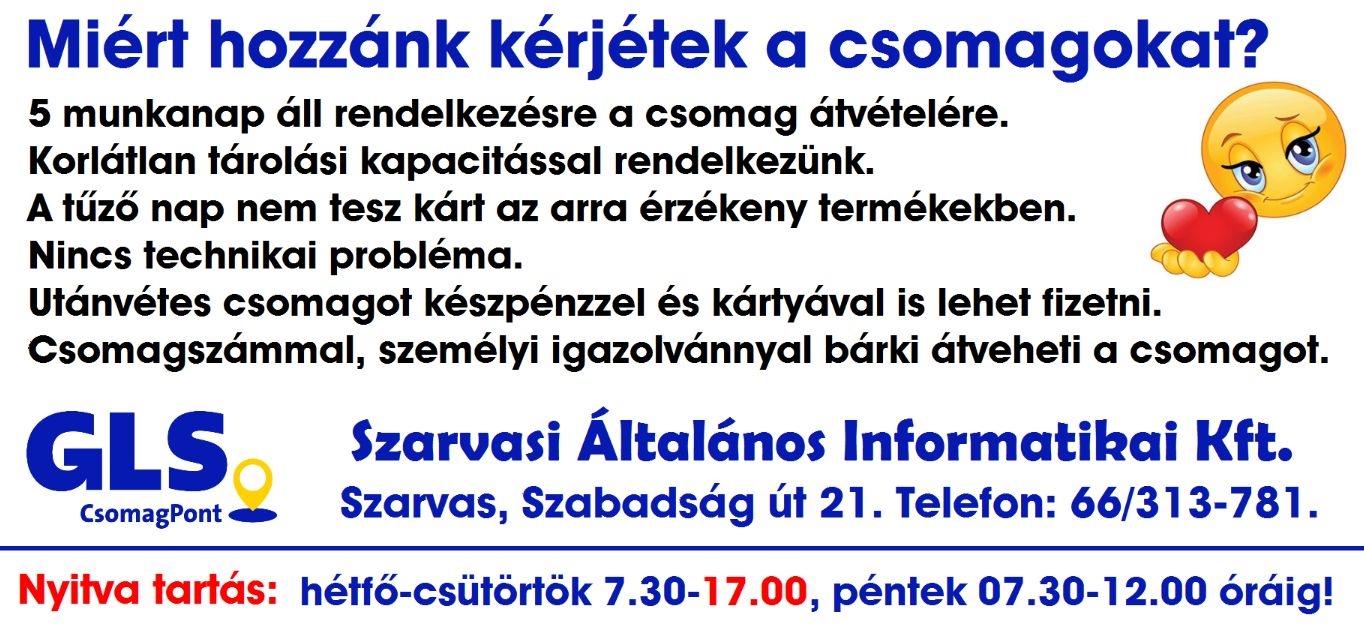 Kiadó: Szarvasi Általános Informatikai Kft. 5540 Szarvas, Szabadság út 21. 5540 Szarvas, Szabadság út 21. Telefon: 66/313-781. 66/313-781. Telefon: 66/313-781. 66/313-781. 66/313-781. Nyitva tartás: Hétfõ 07.30-17.00 Kedd 07.30-17.00