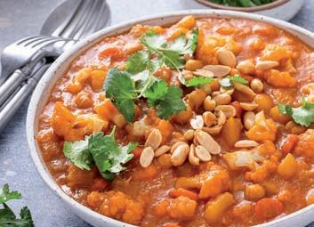 Adjuk hozzá a currypasztát, a karfiolt, a fűszereket, sózzuk, borsozzuk, és öntsük fel a paradicsommal és a kókusztejjel. Alacsony hőfokon, fedő alatt rotyogtassuk 20-25 percig, vagy amíg a karfiol már majdnem készen van, majd adjuk hozzá a csicseriborsót is, és főzzük együtt is további 5 percig.