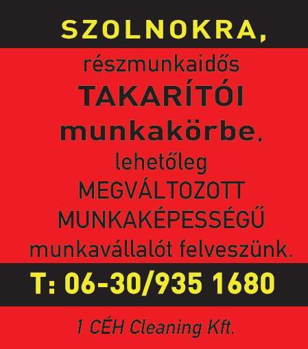 SZOLNOKRA, részmunkaidős TAKARÍTÓI munkakörbe, lehetőleg MEGVÁLTOZOTT MUNKAKÉPESSÉGŰ munkavállalót felveszünk. T: 0630/9351680 1CÉHCleaningKft.