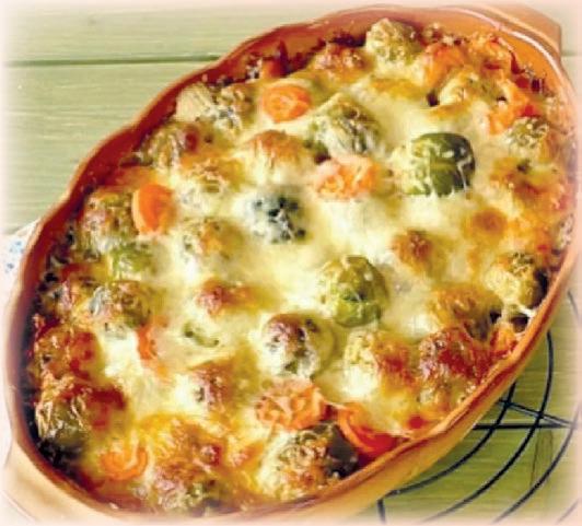 4. A tejszínt elkeverjük a tojássárgájákkal, ízesítjük fokhagymával, szerecsendióval, petrezselyemzölddel, és megsózzuk, megborsozzuk ízlés szerint. A felét ráöntjük a húsra, majd ráhalmozzuk az előtte megpárolt zöldségeket, a sárgarépát és a kelbimbót.