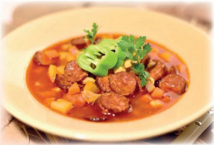 2. A megtisztított zöldségeket, burgonyát kockára, a kolbászt karikára vágjuk, és mindent a pörköltlébe keverünk. Ezután felöntjük 1,5 l vízzel, és lassú forralással puhára főzzük.