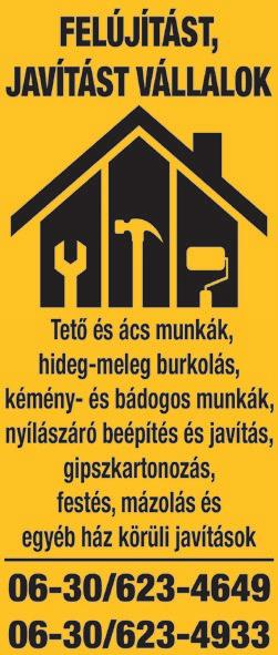 Vállalok bármilyen kisebb tetőjavítást, új tető készítését, cserepezést, illetve cserepes lemezelést, ereszcsatornázást, bádogozást, szélfogó deszka javítását. Kőművesmunkát, hőszigetelést, gipszkartonozást. 06-70/215-7074