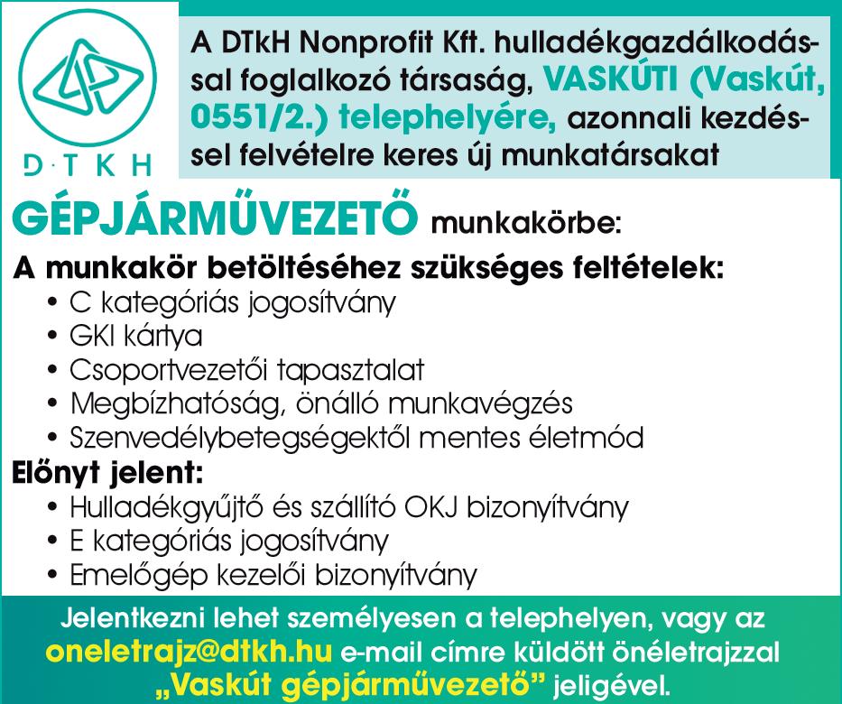 A NI-PA-GÉP Kft. csőhálózat szerelésben jártas munkaerőt keres, B kategóriás jogosítvány nem feltétel, de előny. Érdeklődni: 06-20-377-1645