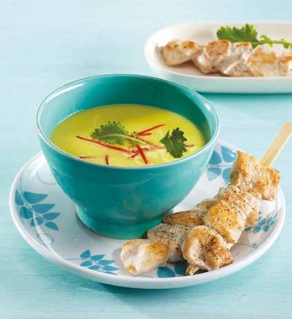 4. Adjuk a kókusztejet a leveshez, és ha szükséges, ismét sózzuk meg. A paprikát magozzuk ki, és a húsát vágjuk fel csíkokra. Azokkal és néhány korianderlevéllel megszórva tálaljuk a levest. A csirkenyársakat külön kínáljuk hozzá.