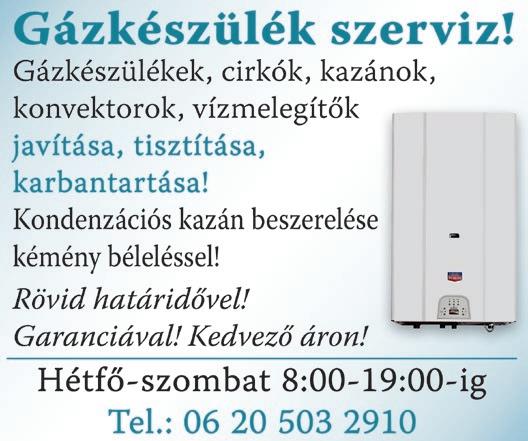 Víz-, fűtésszereléssel kapcsolatos munkákat vállalok, a kisebbektől a nagyobbakig, rövid határidőkkel. Kenyeres Viktor +36-30/881- 1874 Cserepeslemezelés, ácsmunka 30%-os akcióval 2024.12.15-ig. Tetőjavítást, kúpkikenést is vállalok. +36-70/635-5762
