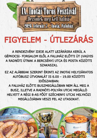 IX. Inotai Toros Fesztivál február 7-én, szombaton az Inotai Faluháznál. 9.00 órától Falusi disznóvágás – A húsfeldolgozás teljes folyamata a disznóperzseléstől a hurkakészítésig 11 órától Kolbásztöltő és -sütő verseny 13.00 Kolbásztöltő és -sütő verseny zsűrizése 11.00 a Cserregő Néptáncegyüttes és az Iciri-Piciri Óvoda apróságai adnak műsort, 14 órától a Puncs zenekar
