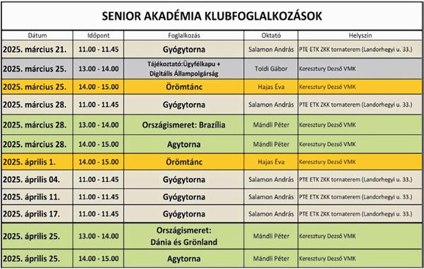 A Senior Akadémia a következő hónapokban is érdekes előadásokat és foglalkozásokat kínál. A hallgatók emellett gyógytornán is részt vehetnek, amelyet kifejezetten az idősebb korosztály igényeihez igazítanak. A következő előadás április 10-én lesz, ahol újabb izgalmas témákkal várják az érdeklődőket. n Z7NAP