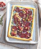 3 A tésztát tekerjük ki, nyomkodjuk kisebb, sütőpapírral bélelt tepsibe úgy, hogy pereme is legyen. Kenjük meg a krémmel, rendezzük el rajta a balzsamecetes céklát. Szórjuk meg a durvára vágott mogyoróval, és süssük aranyszínűre a pitét 200 fokos sütőben kb. 25 perc alatt. Egy kevés friss kakukkfűvel megszórva tálaljuk. Elkészítési idő: 60 perc