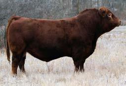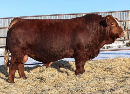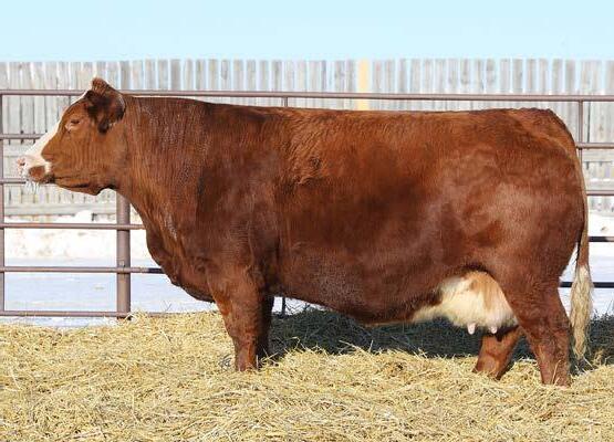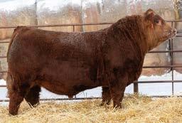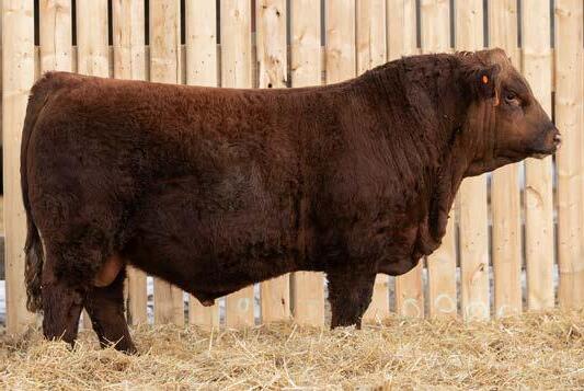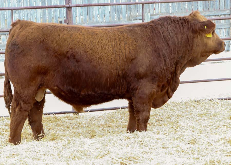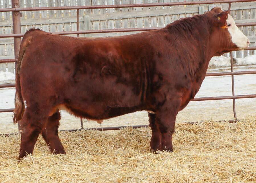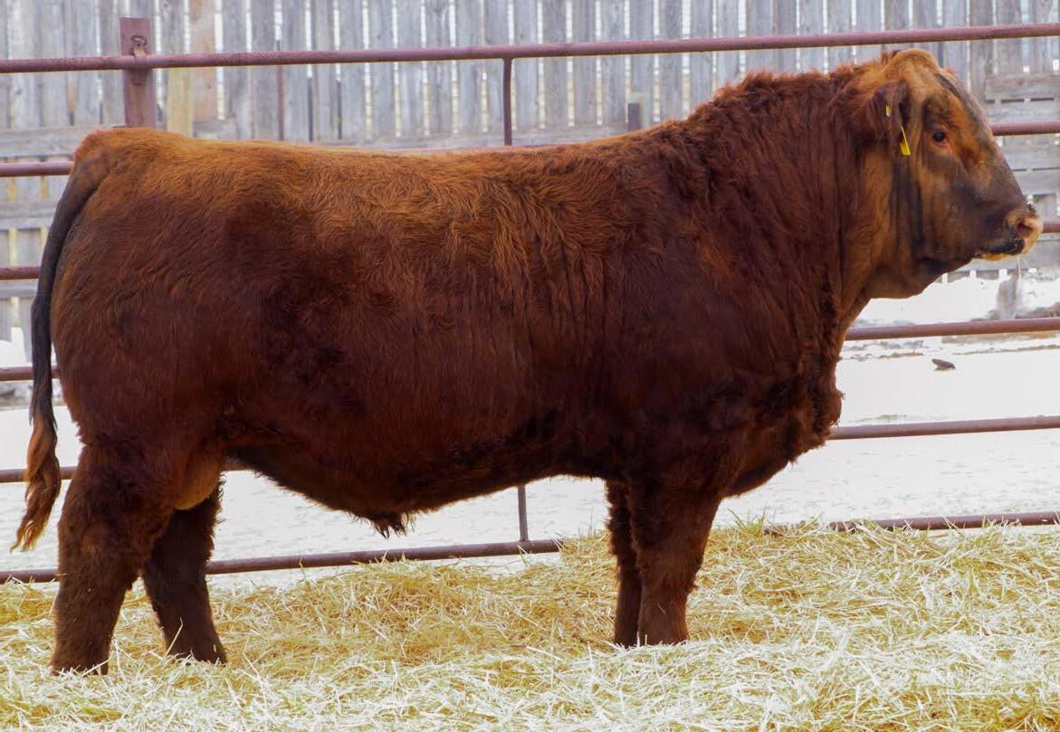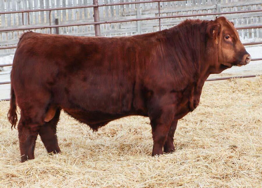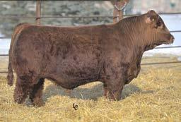 Dark red and long bodied to sire those big steers to really pound down the scales. Dam is an excellent uddered Thunder daughter going back to Anchor D Allison cow.
