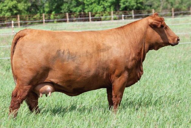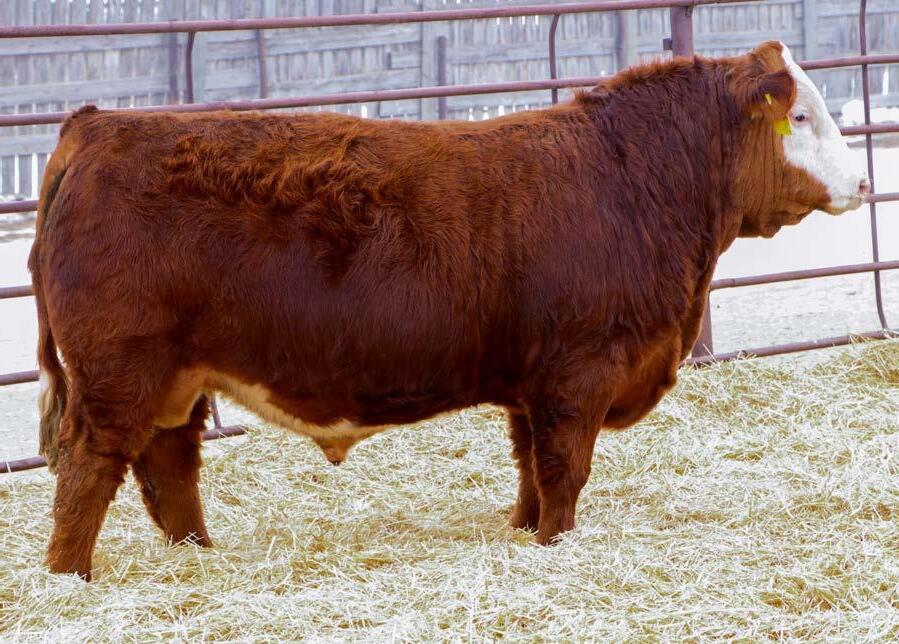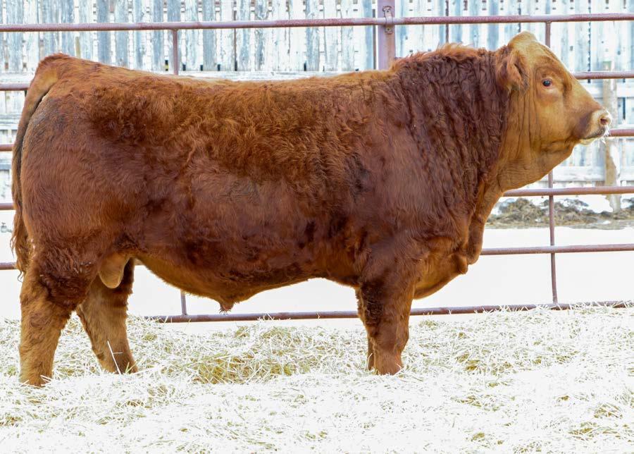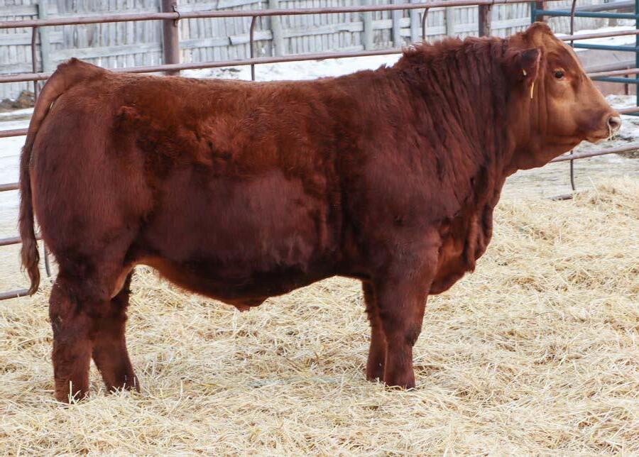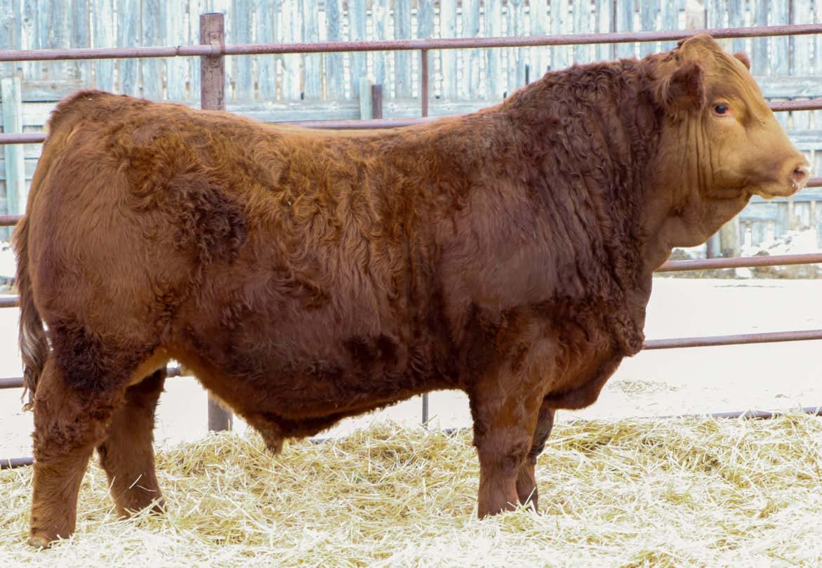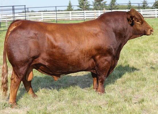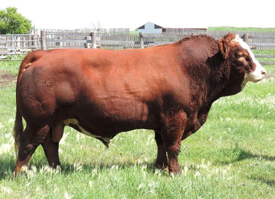 Dark red and long bodied to sire those big steers to really pound down the scales. Dam is an excellent uddered Thunder daughter going back to Anchor D Allison cow.