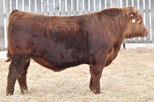 • Get in on the ground floor with this son of SSS Granite and our 78A donor cow. This cow’s production record has made her a donor with sons like Target, Momentum, Bankroll and Express will follow in the footsteps of his brothers. Express is a dark red, black sound footed individual. His stoutness in skeletal structure, mass of muscle and his overall class of appearance will make him one of the highlights in this sale. Serious stockman pay attention to this bull. Here is a breed changer.