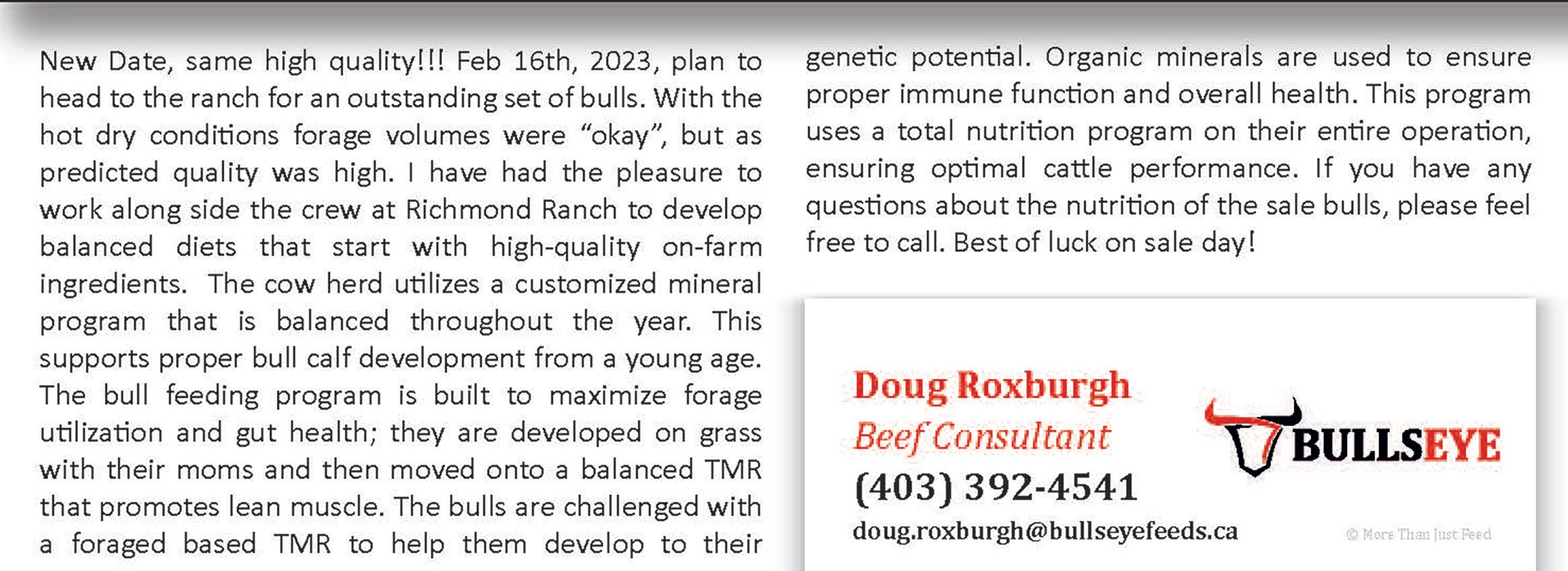 Return Undeliverable Canadian Addresses To: Richmond Ranch Ltd. P.O Box 58 Rumsey, AB TOJ 2Y0 WHERE QUALITY ISN’T A GOAL, IT’S A STANDARD Thursday February 16th, 2023 1:00 PM AT THE RANCH, RUMSEY AB WWW.RICHMONDRANCH.COM
