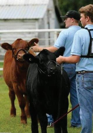 Cooper holding red heifer Snider's Cypher, Owen holding black heifer OJ's Biscuit at AYCSA show