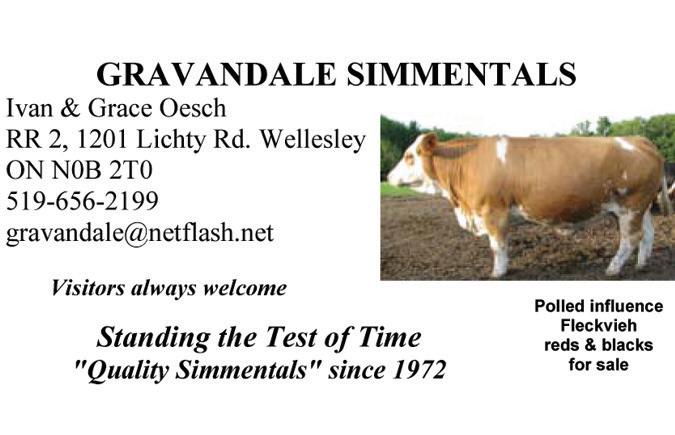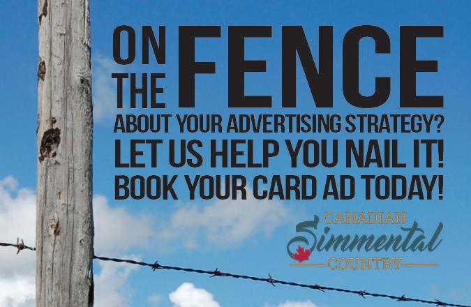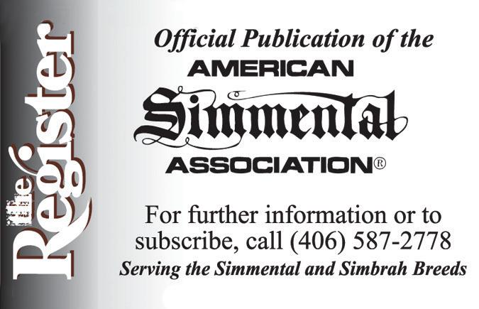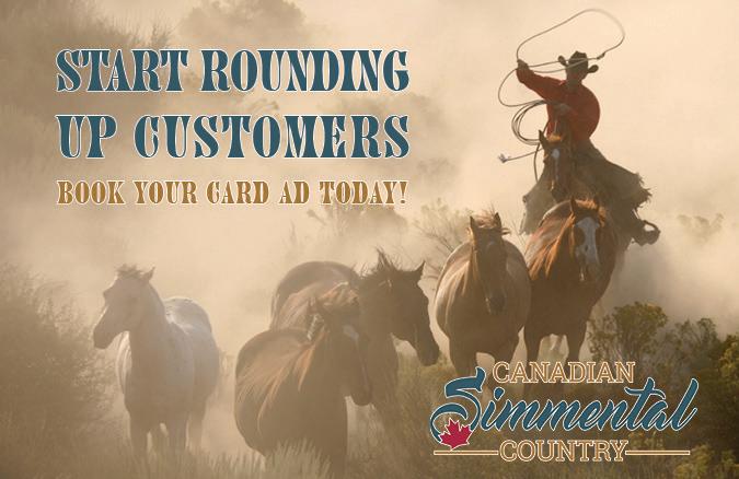 The Simmental Country assumes no responsibility for the accuracy and truthfulness of submitted advertising copy or electronically supplied pictures and has the right to refuse any ad copy or photos. Advertisers shall indemnify and hold harmless the Country containing pedigrees or statements regarding performance must conform to records kept by the Canadian Simmental Association. Copy deviating from official records may be changed as necessary without advertiser consent.