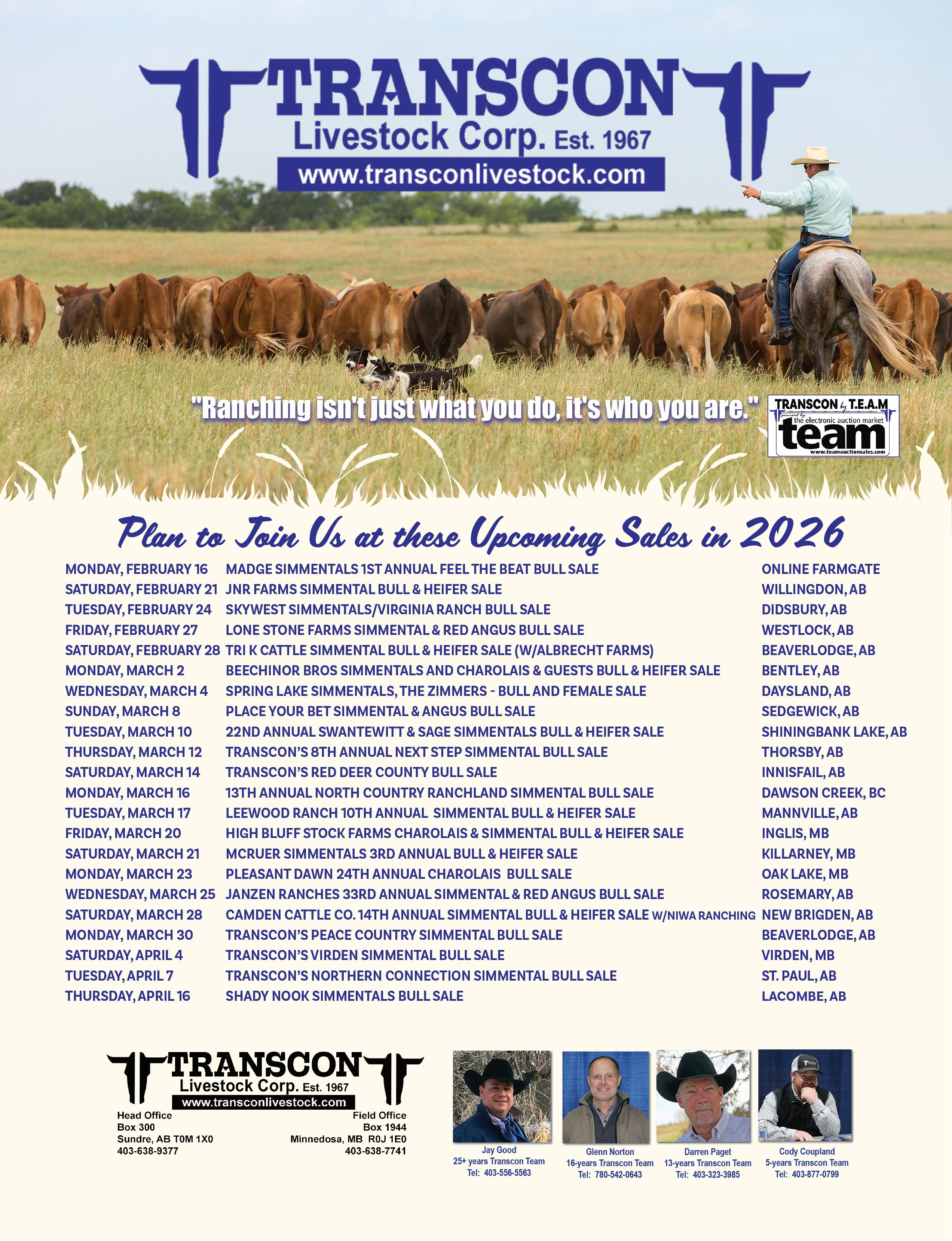 The above 8 bulls, along with 65 other Red, Black and Traditional bulls will be on offer on March 4, 2026. This is a stong group of herdsire prospects offering performance bulls as well as a select group of calving ease bulls. Semen tested, guaranteed and delivered, ready to work for you. Catalogue and videos will be available in early February on our website and Transcon Livestock’s website.