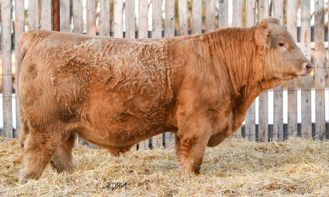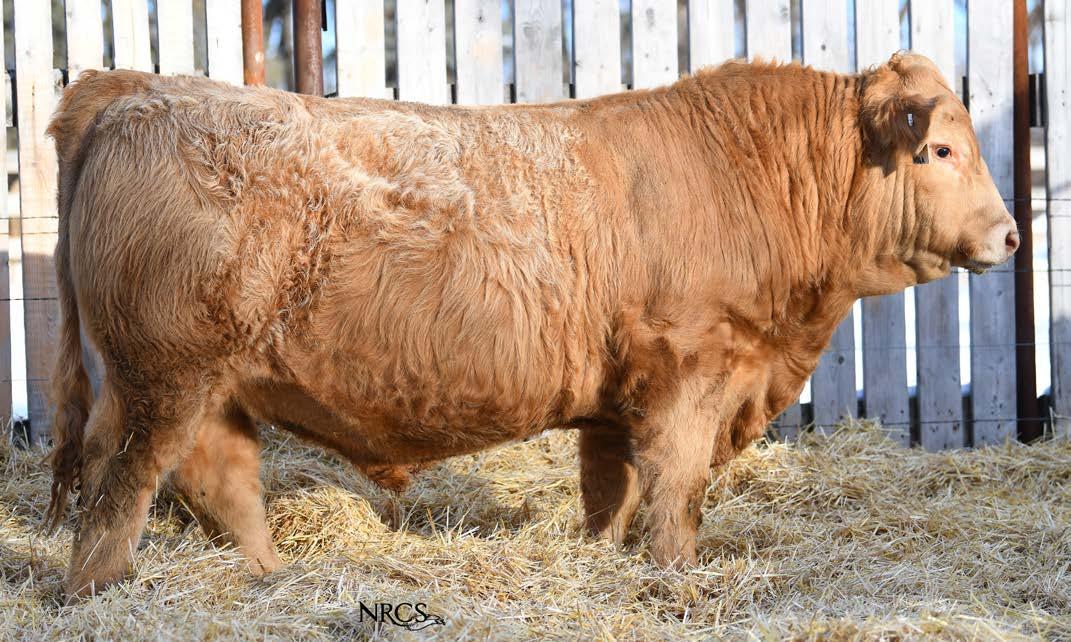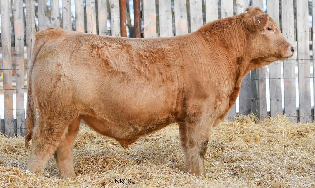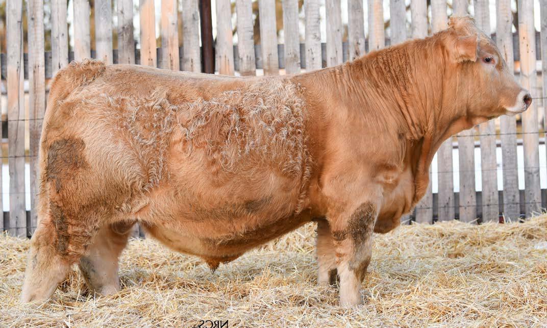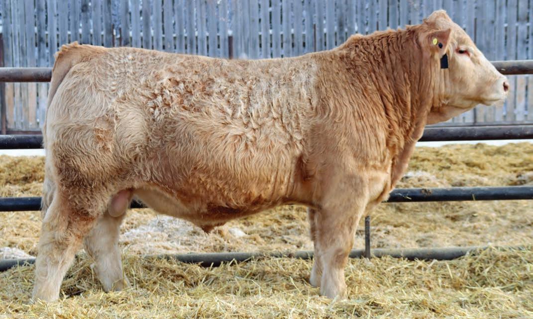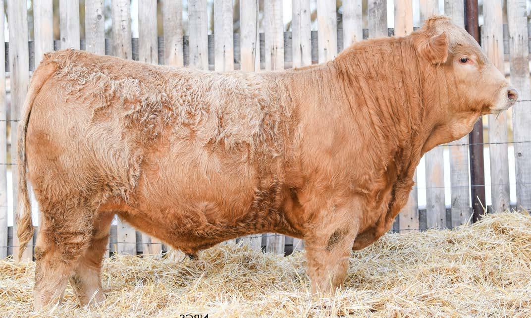 A tan Custom calf with loads of hair and guts. A bull that when you get behind him you can admire for his spring of rib and muscle shape.