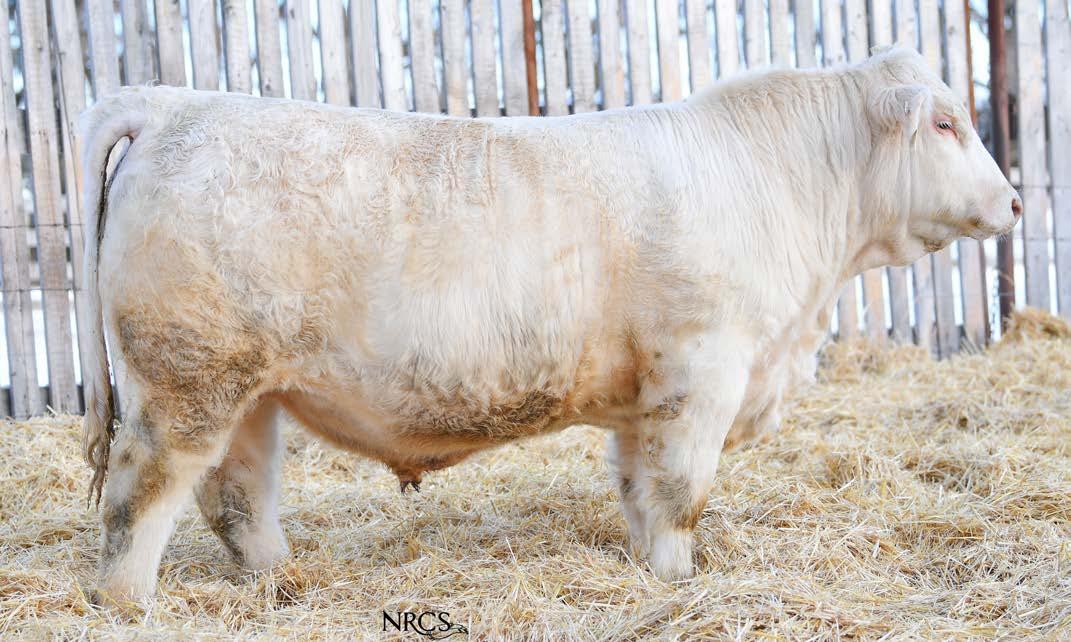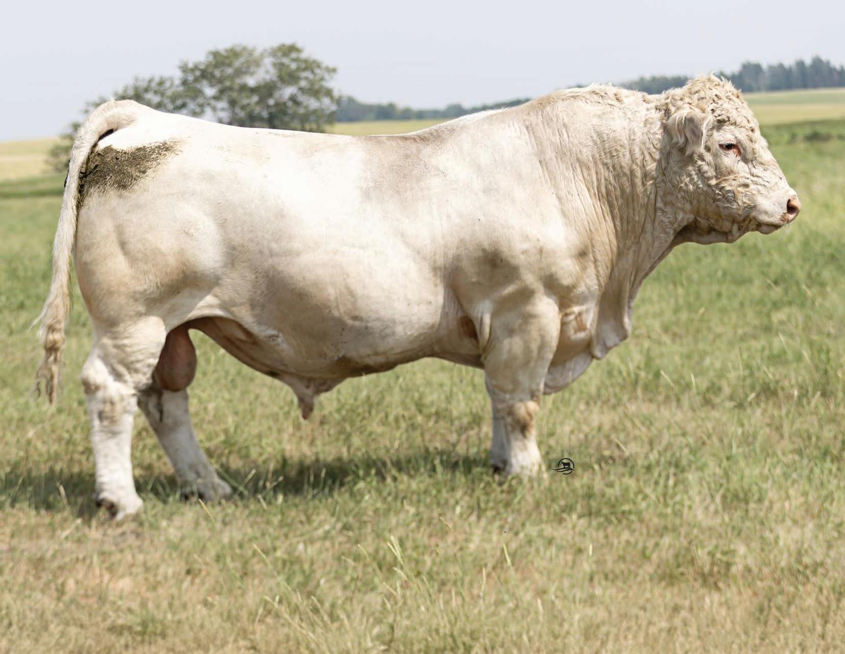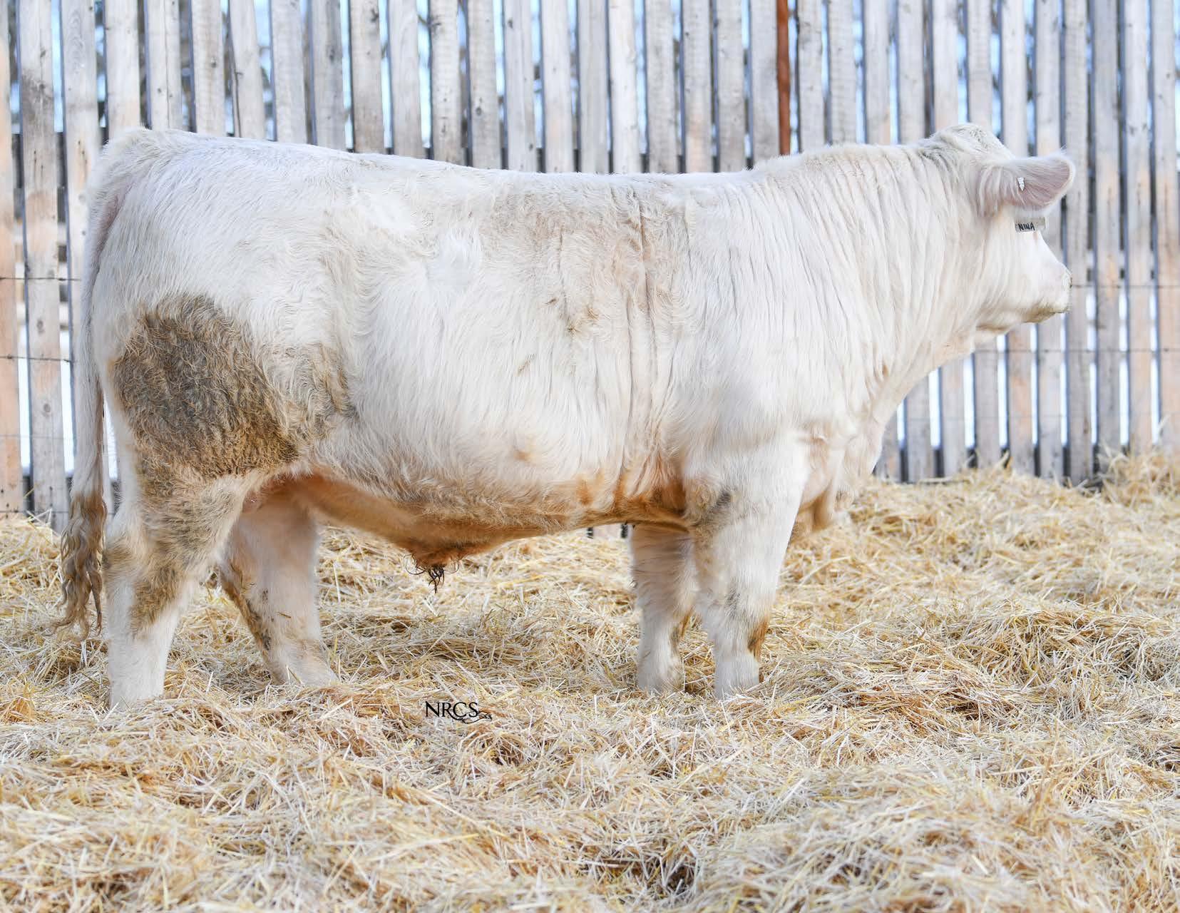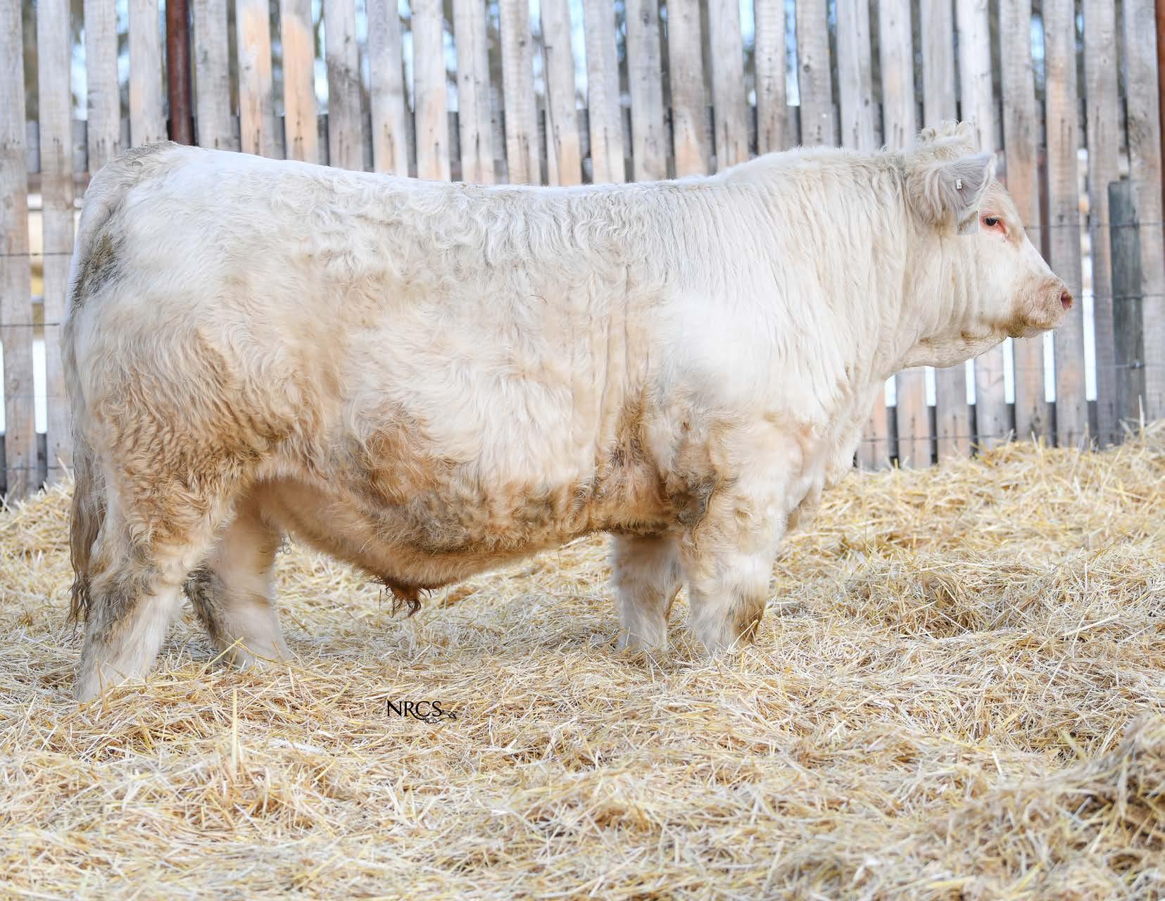 Purchased from Palmer Charolais as a cow bull. Used as a cleanup bull on late calvers for this crop of calves. He was a working machine; his cows were in the main calving pack the next year. His pen of bulls are generally larger framed and coloured. PROGENY