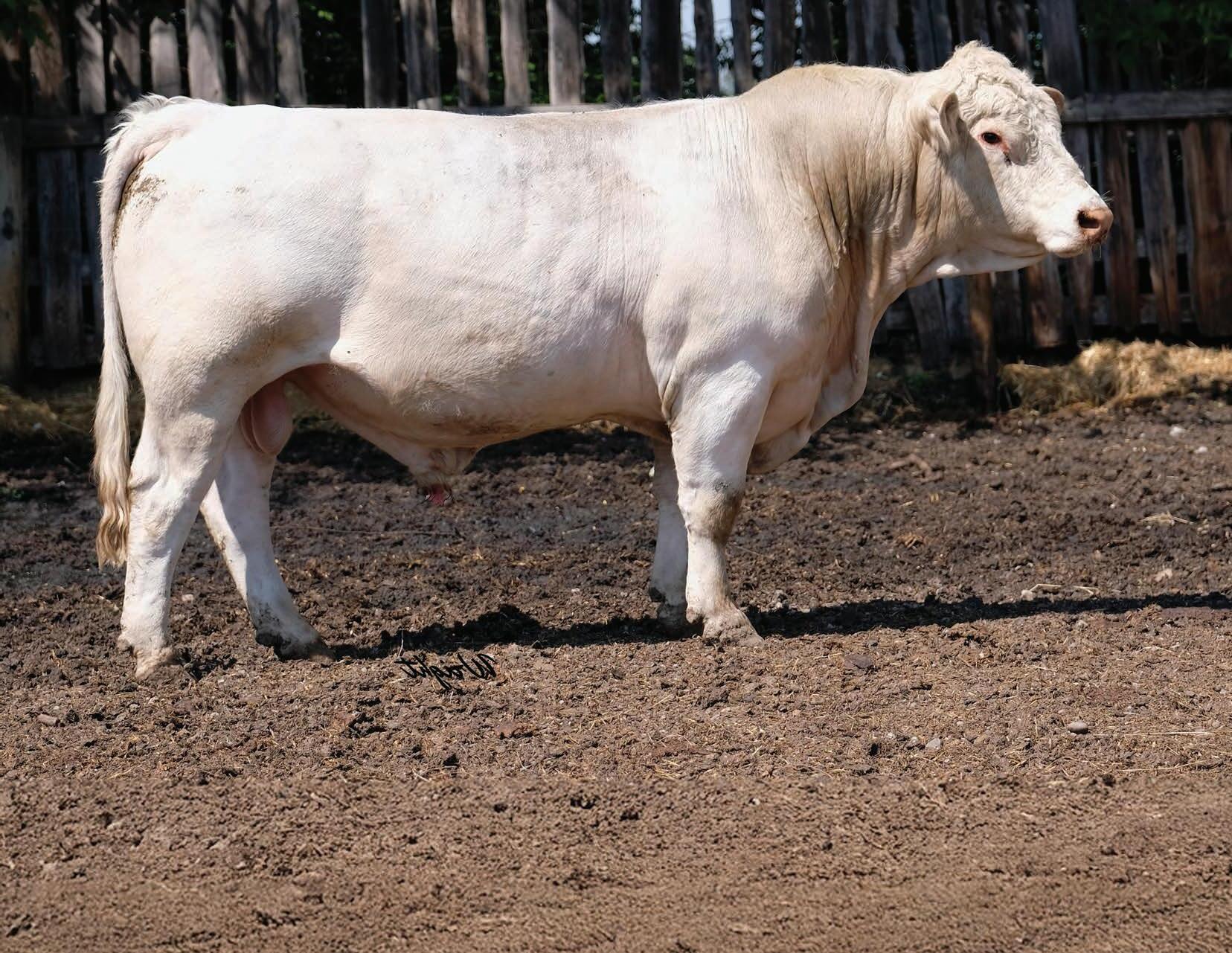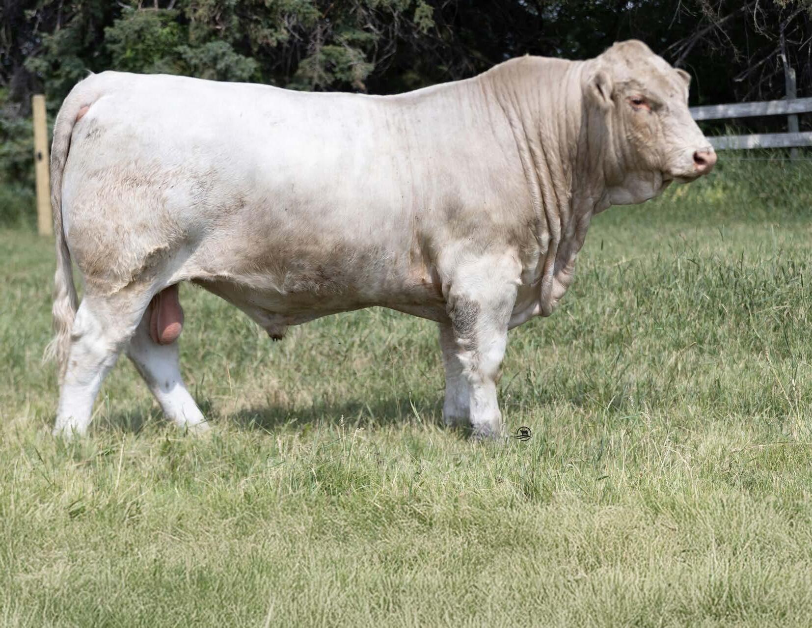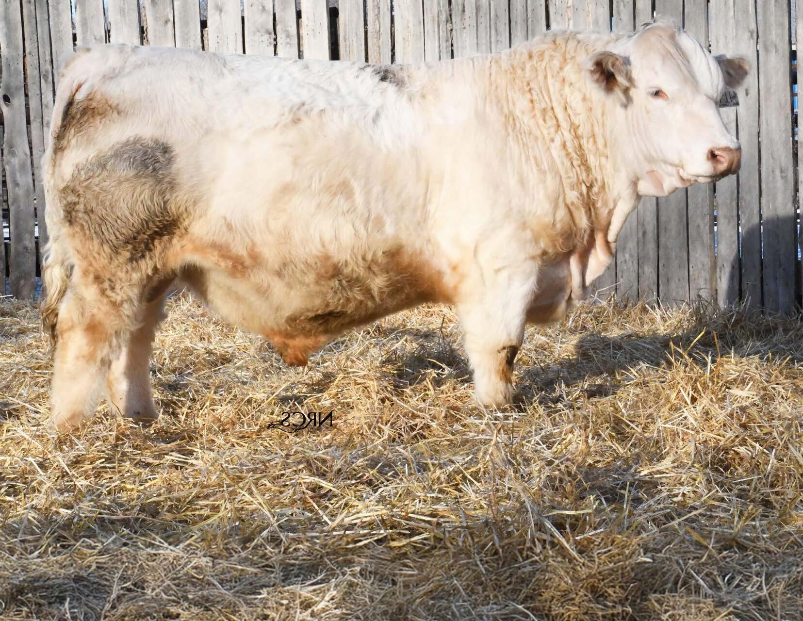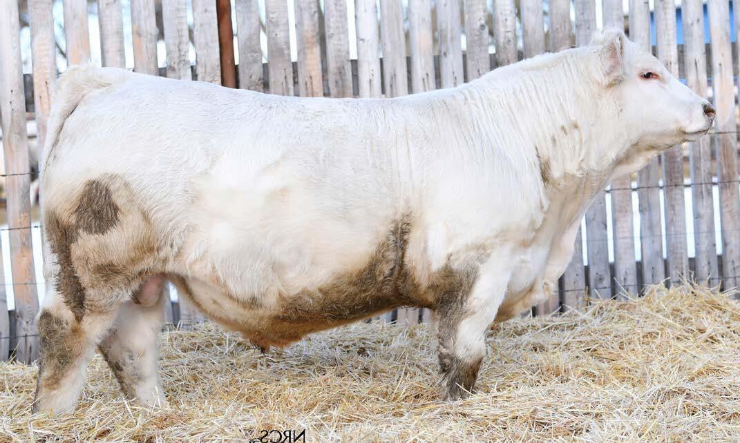 Purchased from Palmer Charolais as a cow bull. Used as a cleanup bull on late calvers for this crop of calves. He was a working machine; his cows were in the main calving pack the next year. His pen of bulls are generally larger framed and coloured. PROGENY