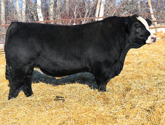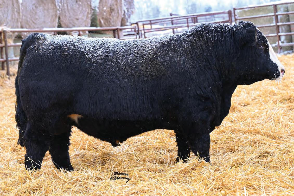 SALE FEATURE! “Texas” as we call him now as the great state is on his face! You can’t help but to stop and stare at this great black white face half blood’s structure and phenotype that make him a crowd favourite! Backed by our double bred Tibbie 93U female, who is also the dam of the herd sire, MLG Essential, this bull will have a lasting impact on any herd with maternal traits and proven production on top and bottom of his pedigree.