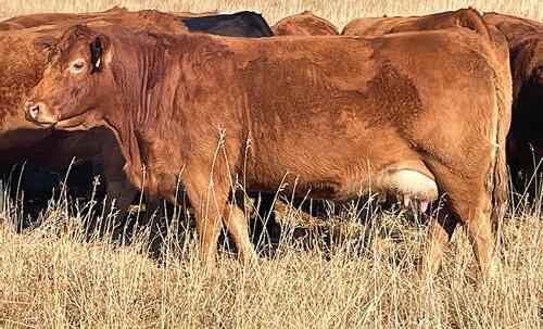 Pasture exposed to Richmond Quarterback SRD 54K. Preg Checked Safe. Estimated to calve 10-Apr.