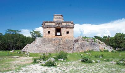 遺跡をひと通り見終わったら、肝心のセノーテ(Cenote Xlacah)でひと泳ぎ(写真右)。ここから見つかった土器や人 骨などから、セノーテは マヤの人々にとって信仰の場所で あったことがわかっている。透き通った水面にはユリが浮 かび、その周りを遺跡が囲う特別な光景を存分に味わおう。 ユカタン半島にはマヤの遺跡スポットが多く存在する が、移動に時間を取られがち。近場でゆっくり遺跡探索を楽 しむなら、ジビルチャルトゥンに決まり!