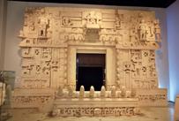 1. セイバの木をイメージ した前衛的なデザインが 特徴の外観 2. マヤの古 代都市、エクバラムの初 代王の墓のファサード(漆 喰装飾)の複製。墓から 発掘された副葬品の数々 は、同博物館に収められ ている