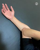 1. デスクやキッチンの台などに手の平が天井を向くよう に前腕を置く(写真①)