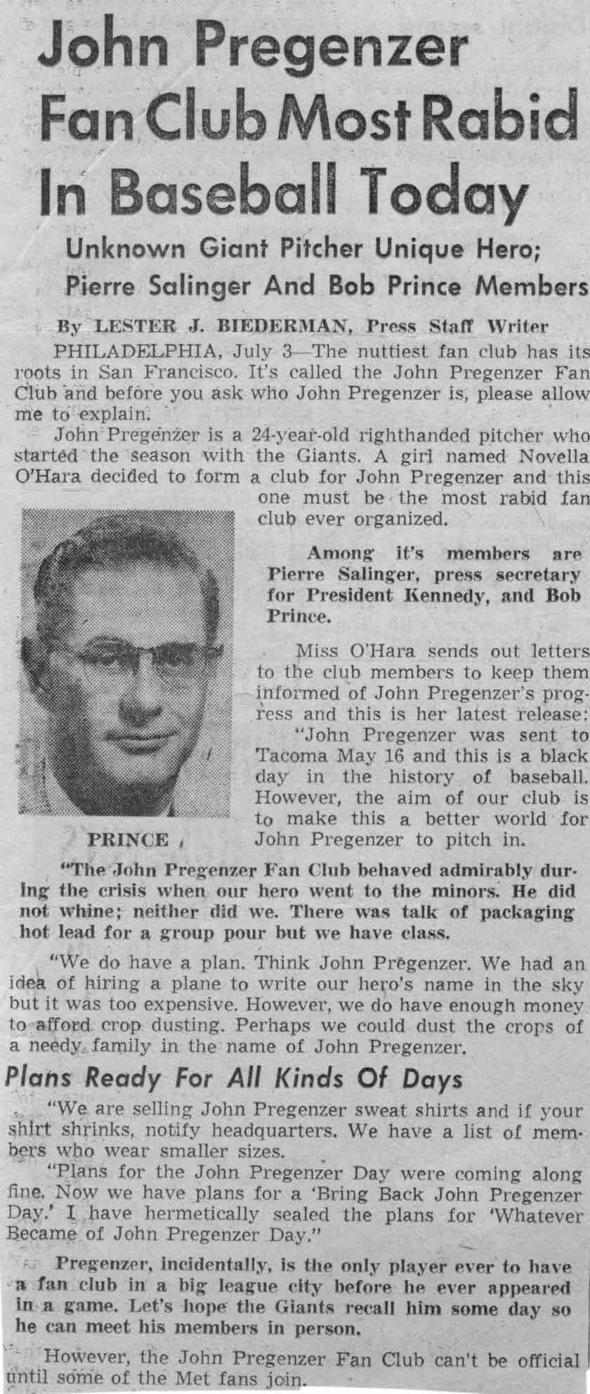Pregenzer attended Illinois Wesleyan University and signed with the Pittsburgh Pirates before being picked up by the San Francisco Giants as a minor leaguer during the 1960-61 offseason in exchange for a $100 waiver fee. He made the Giants’ roster in 1963, and that brought him to the attention of San Francisco Chronicle journalist Novella O’Hara, a baseball fan who wrote the “Question Man” column for the San Francisco Chronicle, who decided to organize the “John Pregenzer Fan Club.”