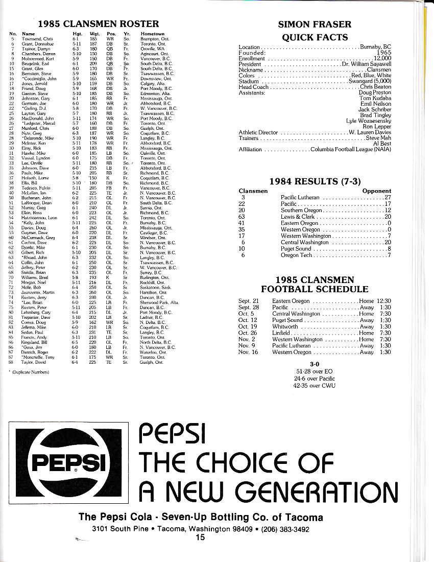 When lookins over CFL oppon€nts ea v in the season Coach Ro$ Iljehclh pointed to the Cla. as the l€ague sleeper a.d to date th€y cerhinl! seem to b€ jusl lnal Th€ clan had a h€roic show ing asainstC€nt6l Washington last w@k as rh€y scored 3 TDs i. th€ linal 138 to .dae rlr wildcah 42 35. ln addirion, rhe cla. has ;osbd victo €s ovd Pacilic 24.6 and Eastem Oreson 5128 SFU E.ks number I in D$ision I ol rhe NAIA in sconns and lras a large number ol .Simo. Frasa has ou ts ra nding peE onn€l, said C.ach Ross Hl€lseth ''rhcv hav€ q€ar phlsi.al s,ze and spad ' The! reall! don't do a n\r thinq fa. c! bu1 that is a sisn of a qood lootball proqDm. Th"y p\e.ute rh€ bas. iud.m€nrals ue4 *el .id dor't beal tremseve5 srLd Hielserh