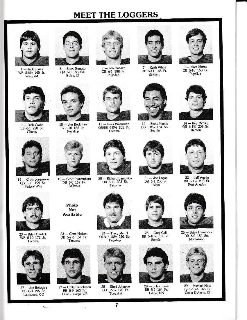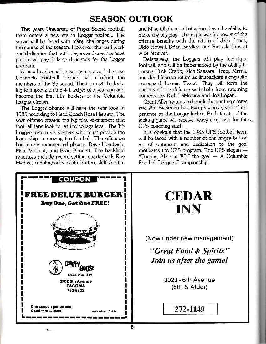 'fhe 1985.85 season. as you k.ow, marks the 6Bt vear ol the university's membe6hip in th€ nd and challenging Columbia F@l ball Lasue. P€reonalLy, I am *cited b! lhe oDporruni! to comPete €guhny nol onl! wiih other independent institutions bur allo o'th pubk coleqes and unvedrbes rn Washnqlon and O eqon Comp€hng w'th thse s.h@ls should add an int€resting nN dim€nsion to Logger f@tball and will €nhance 5 gnrlL.af lly the valu€ and oresnqe oi a Puq€l Sound Leaqu€ Championship benleo lhe Nortn and South