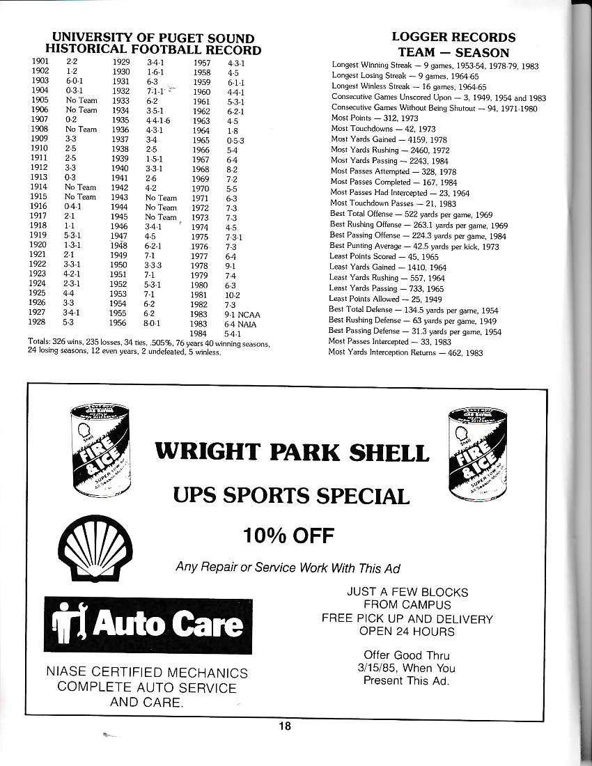 UNIVERSITY OF PUGET SOUND HISTORICAL FOOTBALL BECOBD