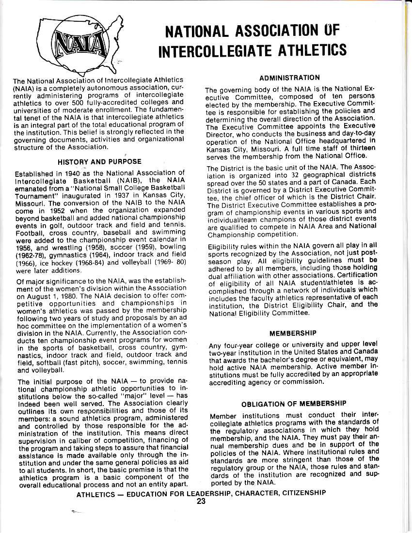 Th. Nalio^al Associar on ol lnlercollegial€ Alhlelics {NAIA) rs a compl€le y auronom prosrame or 'nrerco 6qlale arhreri.s lo over 500 lu unlversn6s or modeiate €nrcllment The lundamenlallener or iha NAIA is that inl€rco les ateathlelcs isan inlearalparl ol iherota educalionaL poOram o, rhe nstilulion.Th. be ier s stono y rerlecled nlhs sovemin! documents, aclvil es and oroanizarional sruciure oi the Assoc alio..