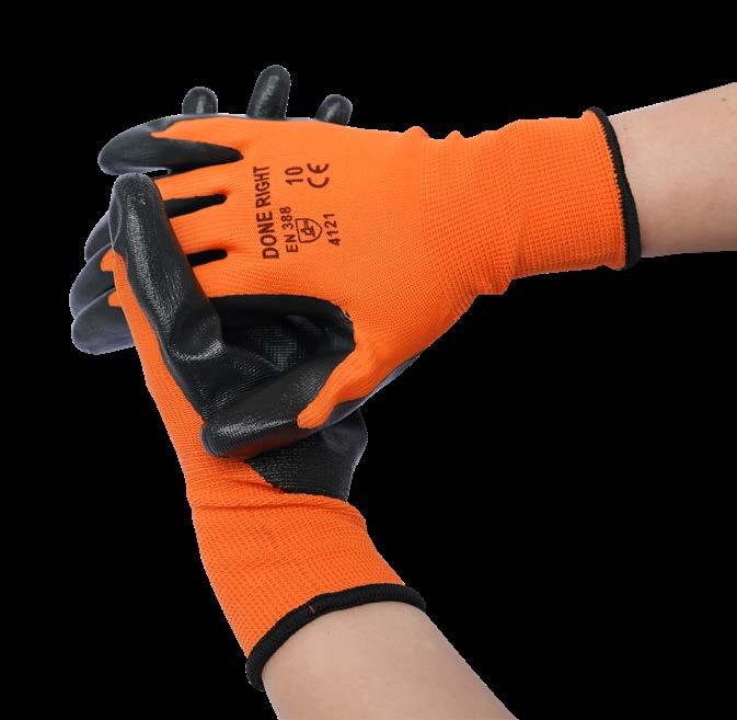 Our Nitrile Gloves are done right, delivering strength, grip, and comfort in one. Made of highperformance nitrile with 13-guage polyester knit wrist and foam liner, they offer excellent dry grip by moving oils and liquids away from the glove surface. CE certified to EN420 and EN388 standards, they’re built for tough, reliable performance. Available in packs of 5.