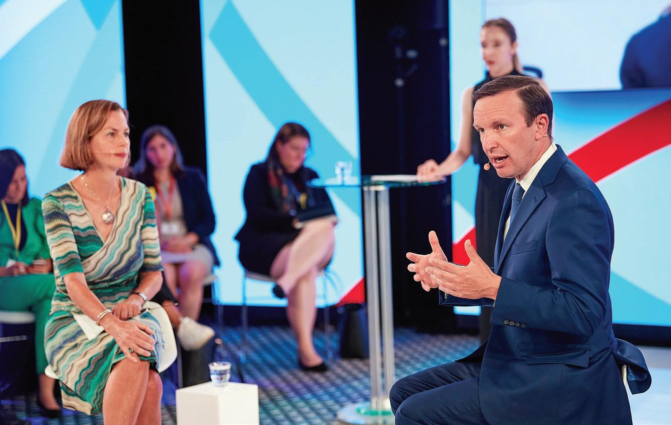 Above: Laura Thornton ’88, senior vice president of democracy at the German Marshall Fund; she also sits on the board of the European Capitals of Democracy. EUROPEAN CAPITALS OF DEMOCRACY Thornton during the Brussels Forum Panel with Senator Chris Murphy and Taiwan Foreign Minister Joseph Wu (not pictured) in 2022. GERMAN MARSHALL FUND Alumni SPOTLIGHTtricky places without established democracy where citizens have no voice or recourse.”