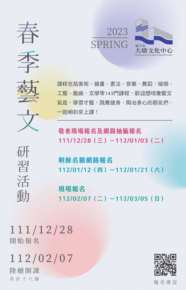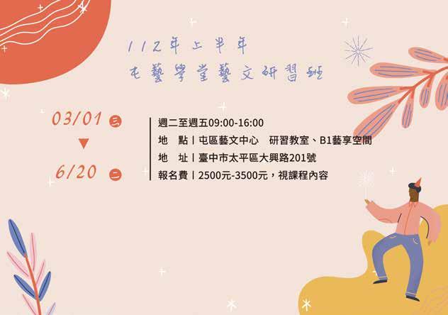 展覽 111/07/23 六 112/01/01 日 轉角遇見大師─莊明中油畫創作展 1、2樓電梯口 111/12/01 四 112/01/01 日 北歐聖誕時光機Chill在屯藝 大廳 111/12/09 五 112/01/01 日 造形魔術師─前進雕塑之都 臺灣雕塑學會聯展 展覽室B 111/12/10 六 112/01/08 日 我看見你是黎明─黃韻如創作展 美學空間 111/12/16 五 112/01/15 日 玩陶,玩真的!我們舒壓的那些時光 展覽室A 01/07 六 04/30 日 轉角遇見大師─張淑美作品展 1、2樓電梯口 01/07 六 02/05 日 臺中市爽文國中第三屆美術班畢業展 展覽室B 01/14 六 02/12 日 2023「屯藝學堂─藝展身手」成果展 美學空間 表演 01/28 六 10:00-11:00 鈴極限表演團《鈴極限新春演出》 1樓大廳 綜合活動 01/08 日 10:00-12:00 玉兔招福注連繩 B1藝享空間 01/14 六 09:30-11:30 2023「玉兔迎春」新春揮毫 1樓大廳 01/14 六 14:00-16:00 關注失智《阿嬤,不要忘記我》 電影賞析 3樓大會議室 01/15 日 10:00-10:50 親子繪本故事屋─Thanks You , Mr.Panda B1藝享空間 01/15 日 14:00-16:00 兔年手繪燙金紅包袋 B1藝享空間 01/29 日 10:00-10:50 親子繪本故事屋─故事大冒險 B1藝享空間 屯區藝文中心112年上半年「屯藝學堂—藝文研習班」,課程包含— 創意手作皮雕、烏克麗麗、彩墨創作、樂活畫水彩、水墨山水創作、 生活茶(易)藝—初階、生活茶(易)藝—進階、水墨山水畫、寫 意花鳥、玻璃嵌畫、輕鬆學油畫、書法行書入門、水彩與速寫(初 階)、壓克力彩繪畫等課程,活動將於112年2月報名,歡迎有興 趣的民眾踴躍報名參加。 17 藝饗 PLUS