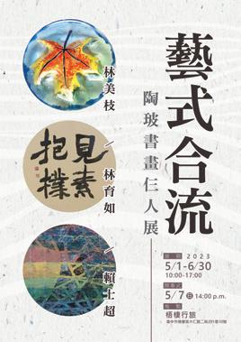 林美枝、林育如及賴士超三位老師都來自教育界, 各自以陶藝、玻璃、油畫、書法、水墨及膠彩等不 同的創作表現形式,在藝術的道路上合流繼續攜手 前進,也邀請您來一場美的行旅。