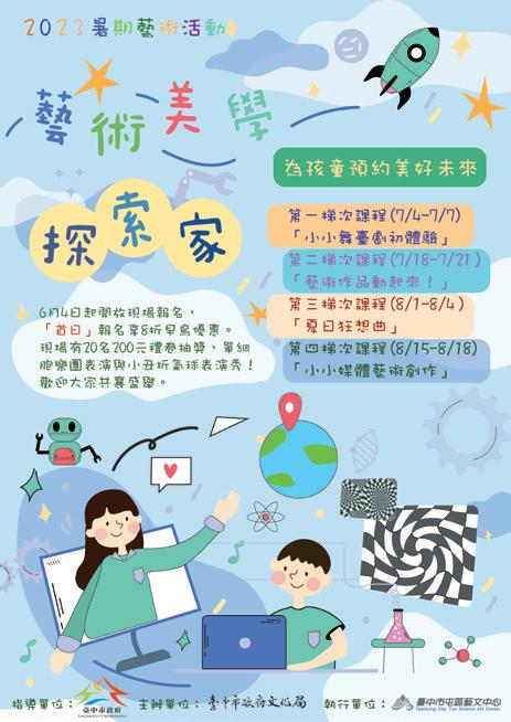 屯區藝文中心於暑假推出「2023 暑期藝術活動」,今年主題 為「藝術美學探索家」,將藝術結合科技,規劃四個梯次的帶 狀課程,包含表演藝術、藝術科技、音樂藝術、藝術創作等領 域,邀請專業老師帶領學童,激發美感想像力、藝術軟實力,並啟發多元未來發展, 6 月 4 日起開放報名,首日限定 8 折優惠,當日報名就送療癒午睡枕,除了精彩表演及 200 元 全聯禮券抽獎,還有造型氣球大放送,詳情請洽官網或臉書。