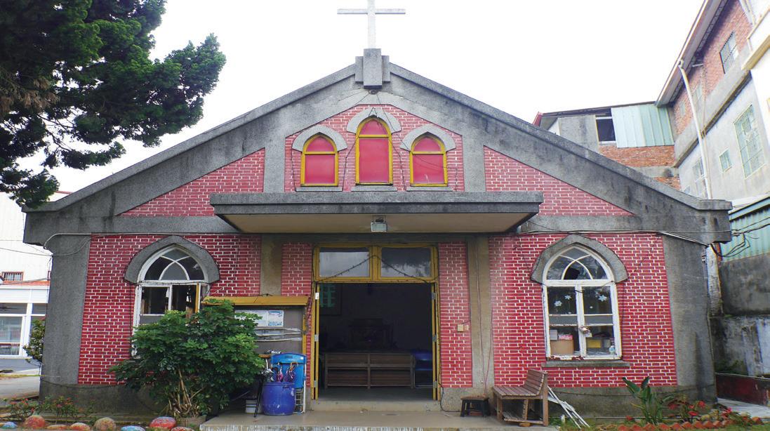 面為主體的基本立面造型,正立面頂端設置有 十字架,側立面牆體大面積開低尖拱窗(drop arch),其上為洗石子裝飾,門窗材質以木材及 玻璃為主,屋頂為雙槽水泥瓦,教堂整體色系為 灰、紅交錯,靜謐和諧,明確表明是基督信仰傳 播之處,為 1960 ~ 1970 年代臺灣常見的地方 教堂形式。