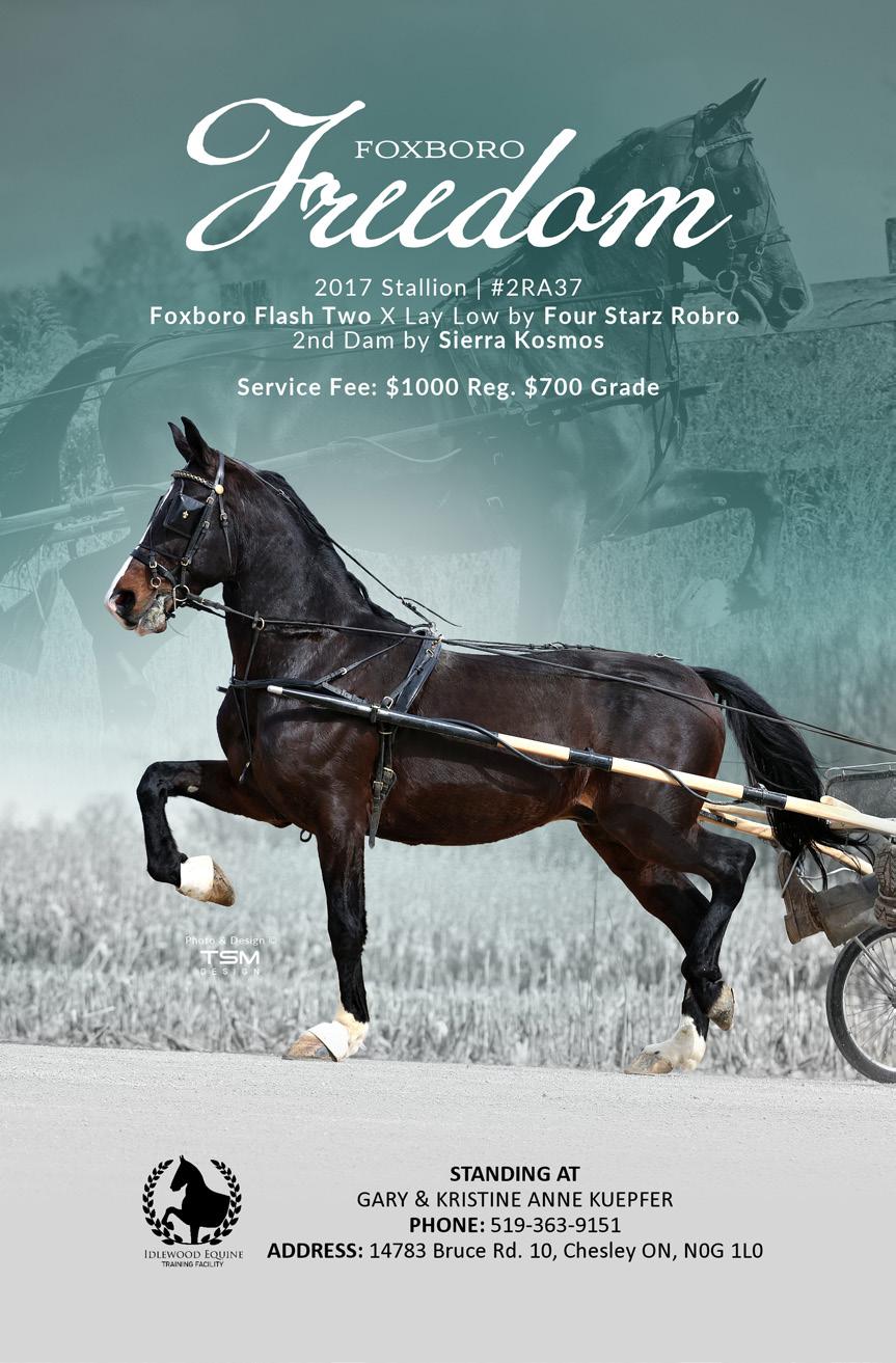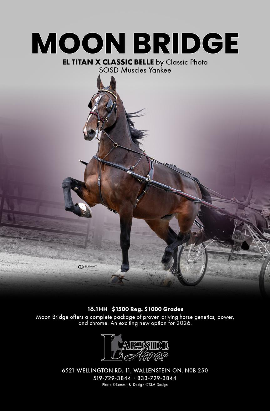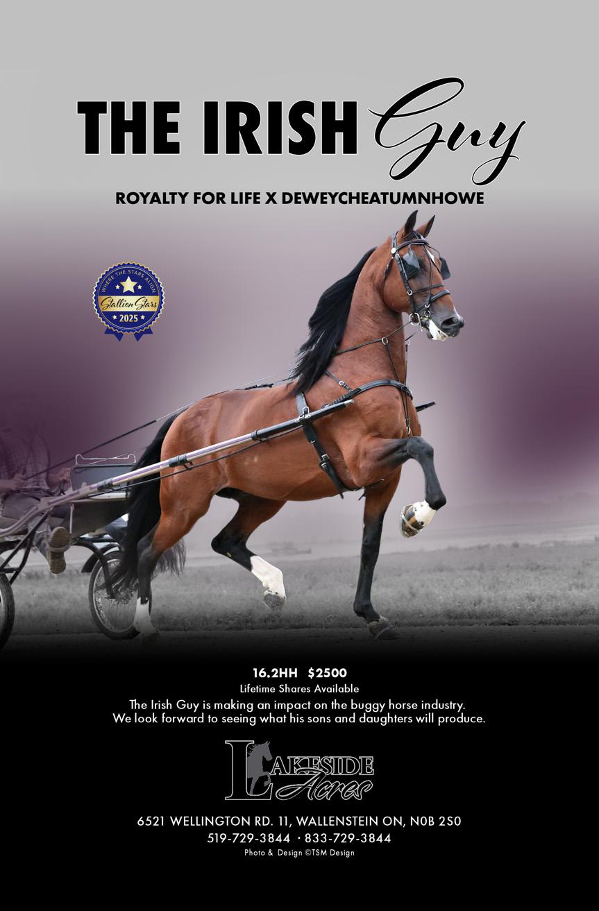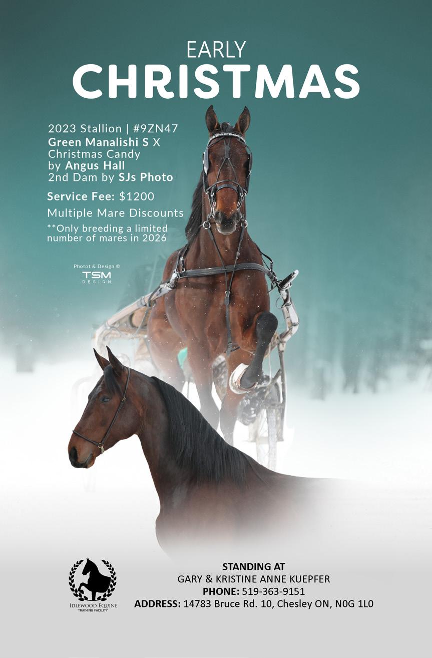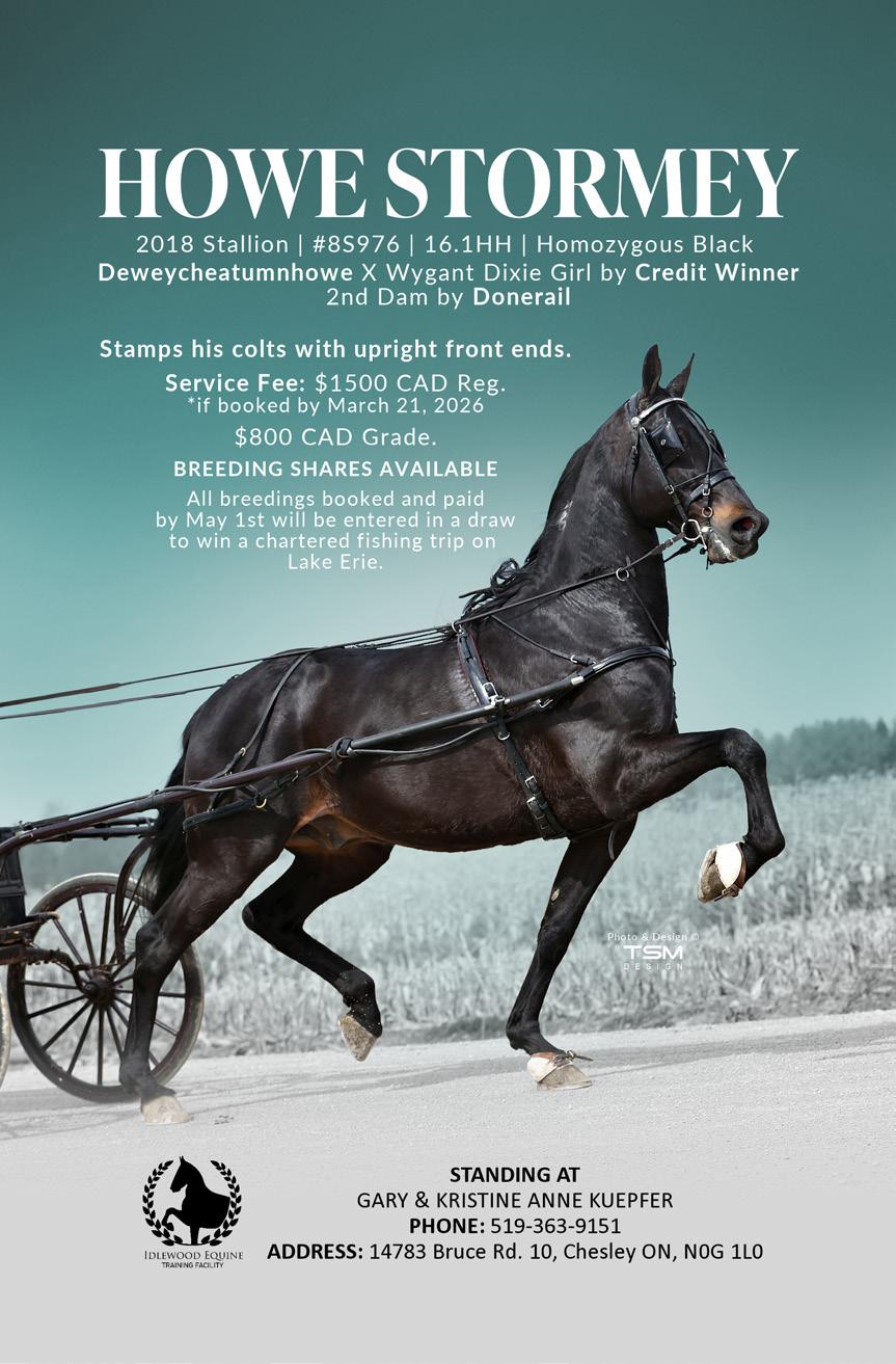 COMMENTS: Amish Boys offspring are showing a lot of promise with a bright eye, nice head and neck, with a little bit of fire. His eldest Canadian crop is now 3 years old and starting on the road. Amish Boys is standing at Carrick Stables for 2026. $650 Reg. and $500 Grade.