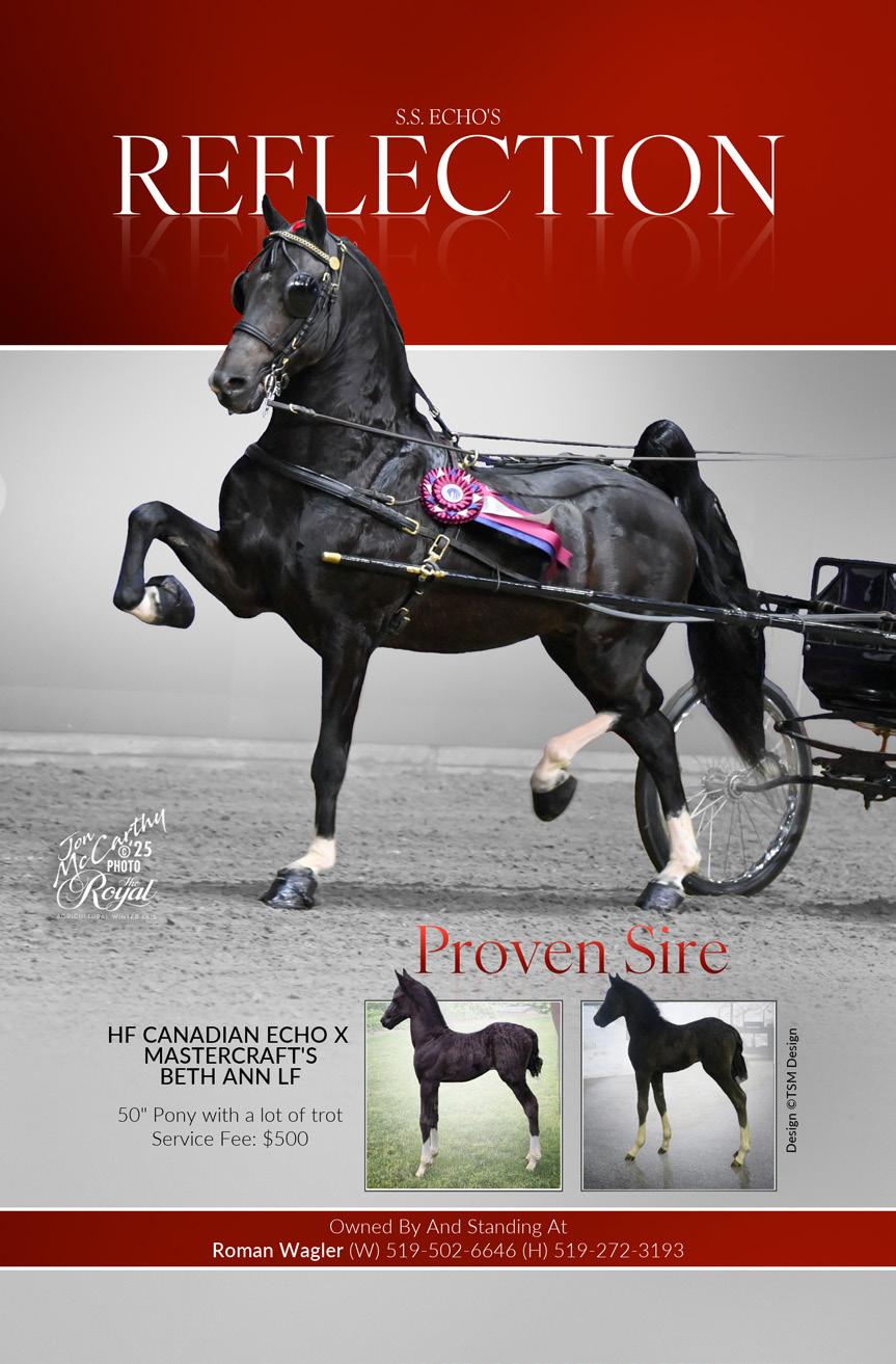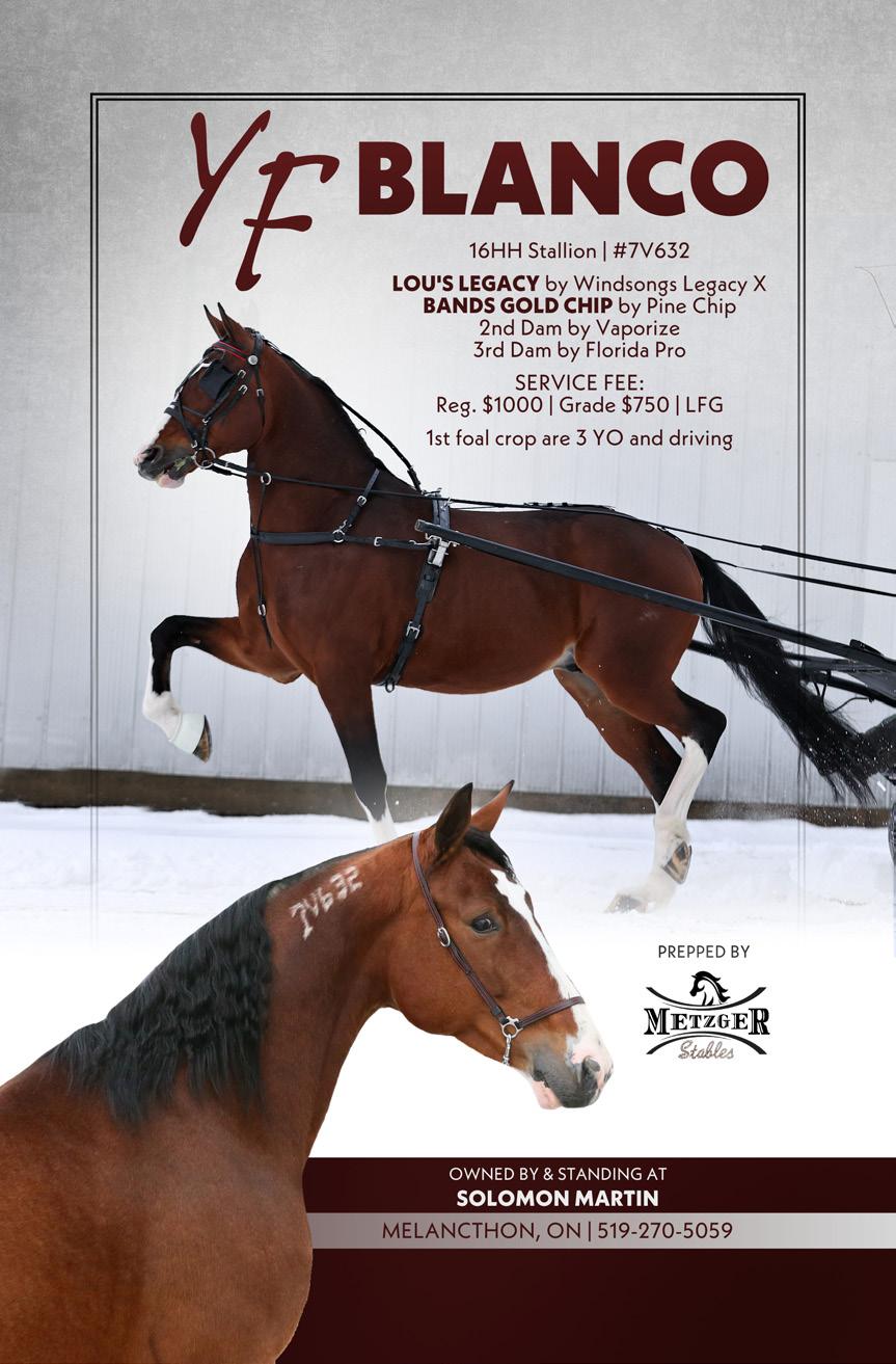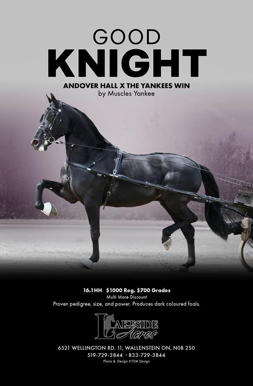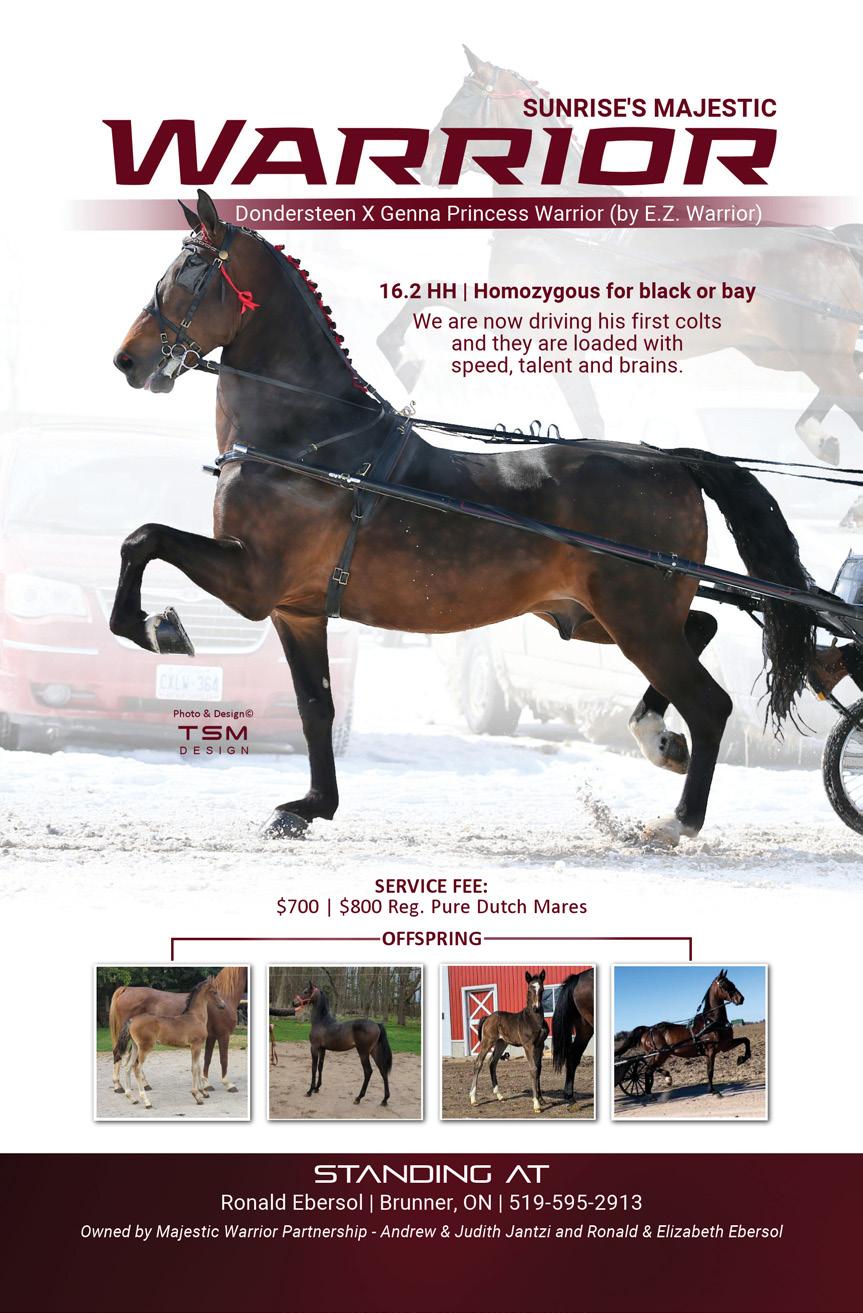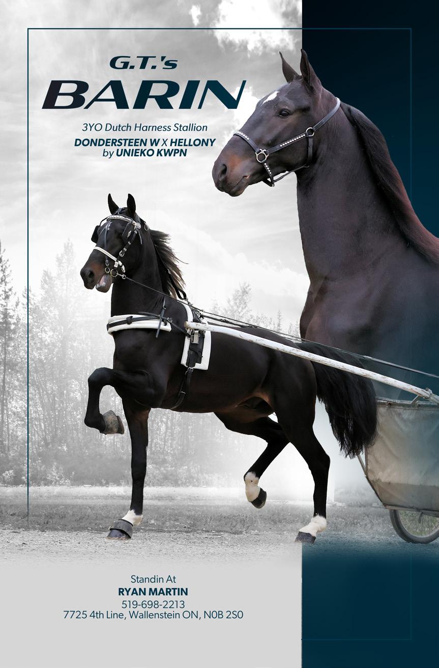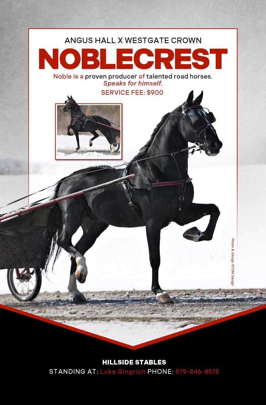 COMMENTS: Amish Boys offspring are showing a lot of promise with a bright eye, nice head and neck, with a little bit of fire. His eldest Canadian crop is now 3 years old and starting on the road. Amish Boys is standing at Carrick Stables for 2026. $650 Reg. and $500 Grade.