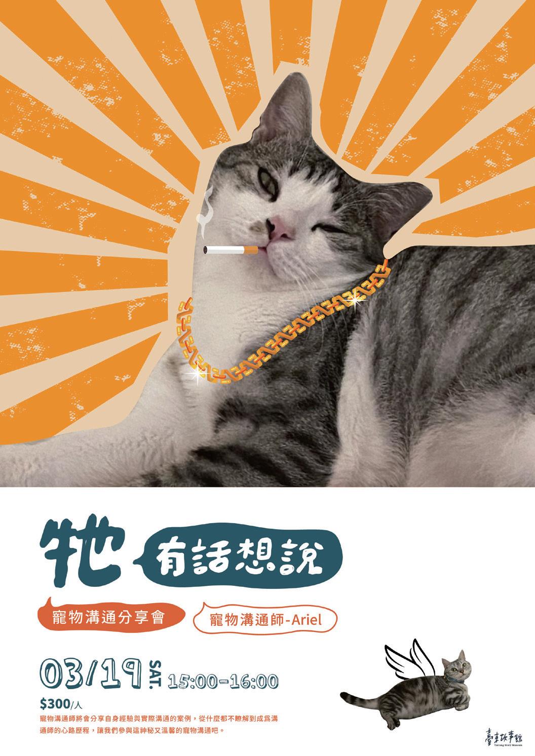 31 藝文進行式 What’s On 「牠有話想說」寵物溝通分享會 時間: 15:00-16:00 地點:臺東故事館03/19 喜愛動物的你,每當毛小孩那雙明亮的雙眼望著你時,每當牠們有難以理解的行為時,每 當牠們看似心情不佳不舒服時,你是不是都會想著:「如果我知道你怎麼了就好了。」 什麼是寵物溝通?怎麼溝通?透過意念嗎?透過畫面嗎?還是某種傳遞訊息的能量?這次 活動寵物溝通分享會將回答你對寵物溝通的一百種問題!對寵物溝通一頭霧水的你,喜愛 動物的你,想成為溝通師的你,讓寵物溝通師Ariel帶領我們了解其中的愛與意義吧! *課堂結束後,將抽獎三位幸運兒,一人一個問題免費諮詢! 讓寵物告訴你,牠想說的話~