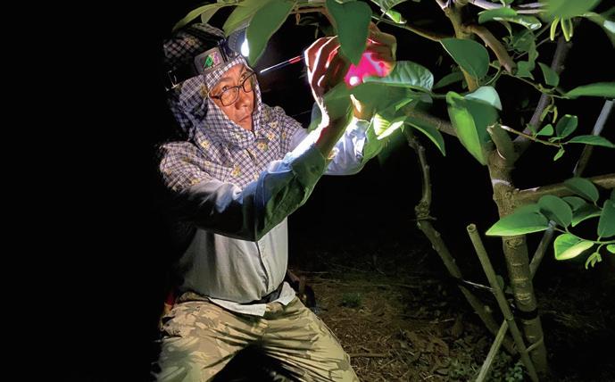 20 2020年10月的某天晚上,調查員跟 著「農夫很忙工作坊」負責人方明富及 「不忙Bu mang」老闆娘的腳步,來到 東河一處的釋迦園,沿途路燈稀少,幾 乎可以說是無光害的果園。晚上的釋迦 園在忙什麼呢?「晚上要來幫鳳梨釋迦 授粉。」方明富說道。只見方明富拿出 一隻未沾水的小毛筆及一個小杯子,杯 子內是先前已採集完畢的雄花花粉,小 毛筆沾了一點粉之後,撥開花瓣,將小 毛筆上的花粉沾抹於雌蕊的住頭上,完 成授粉作業。再來就是靜候120~160天 左右,等待採收可口多汁的鳳梨釋迦。 台東食育提案所—— 鳳梨釋迦 TEXT、PHOTO_台東食育提案所 市面上所看到長相漂亮、顆顆飽滿的鳳梨釋迦, 都是農夫們辛勤耕耘的成果。晚上調查員跟隨農夫的腳步, 在東河一處昏暗的釋迦園,僅限夜晚開花的鳳梨釋迦進行務農一大關鍵。 1